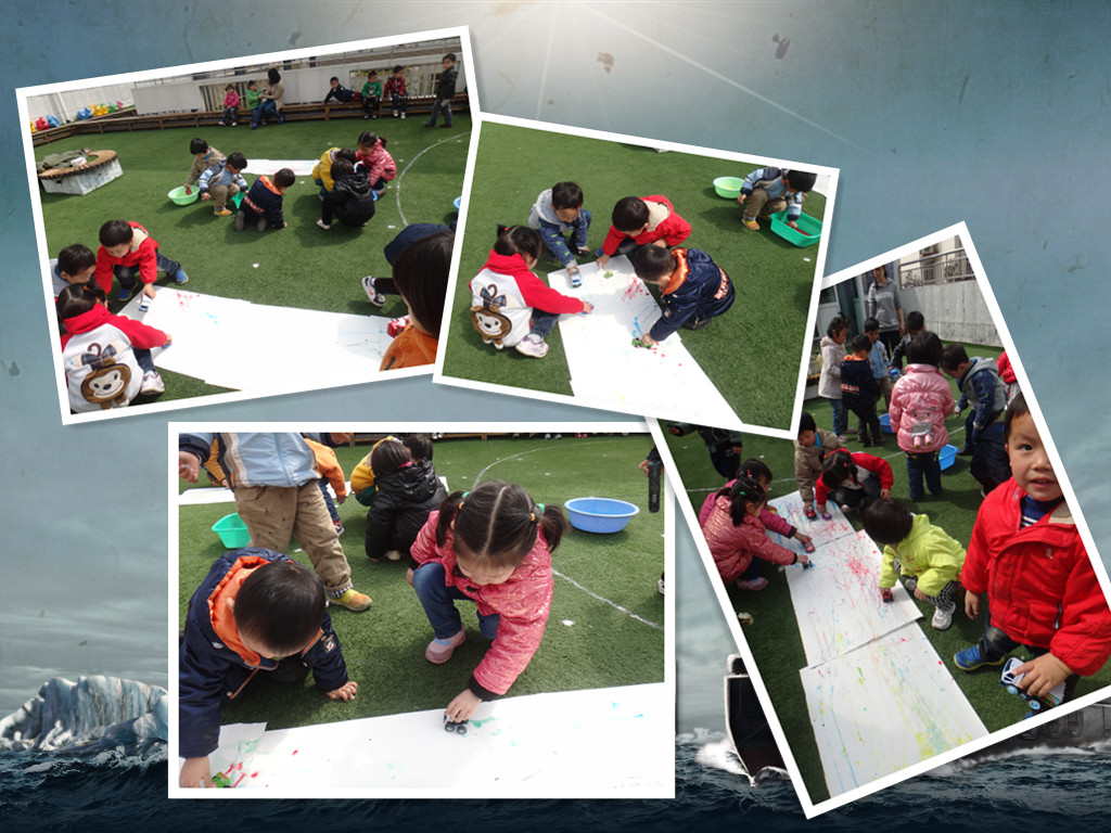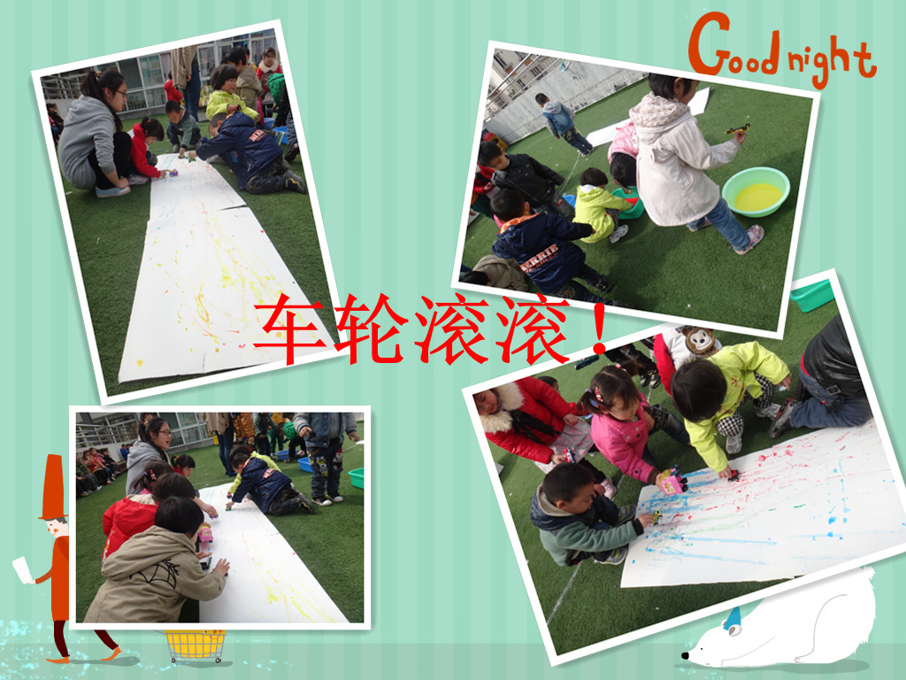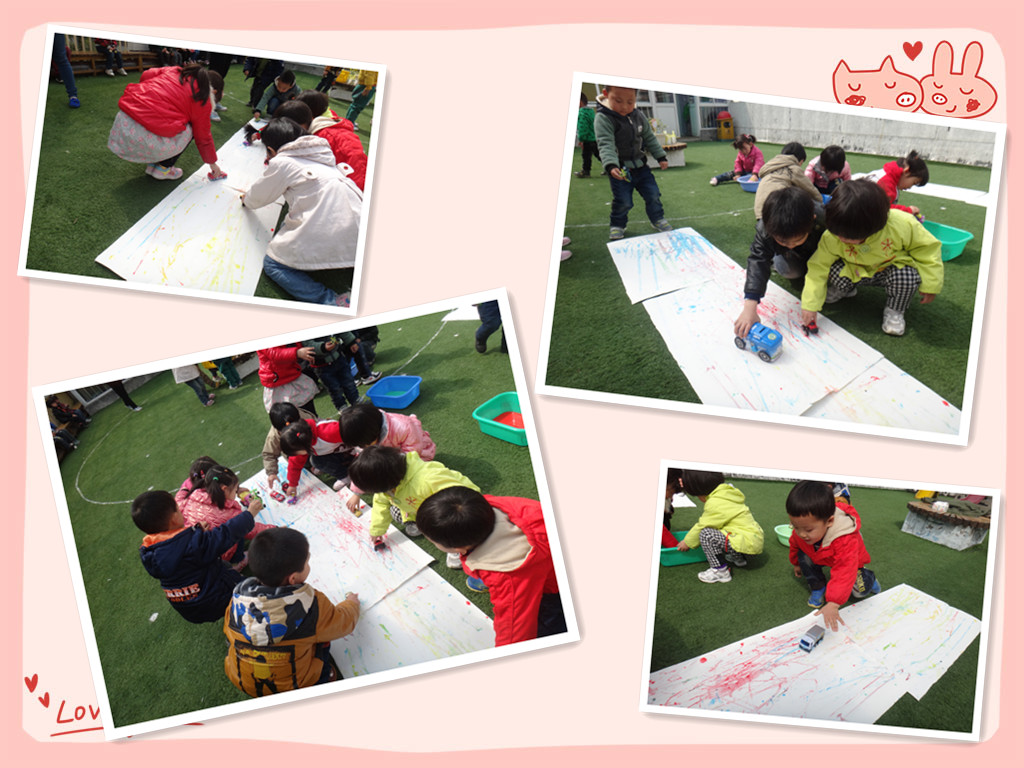 今天是我们小六班第二次特色活动!我们继续第一次的活动方式,选择了大量的颜料让小朋友们去感受和探索!玩色离不开丰富的颜料,于是我们借助小汽车的轮子来作画,感受春天的气息!带来一幅幅美丽的春天的线条!让小汽车在纸上开出美丽的春天吧!