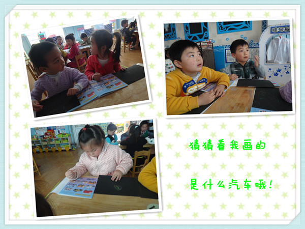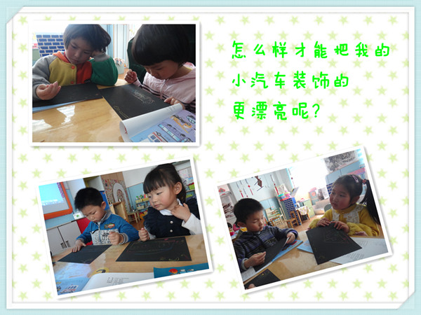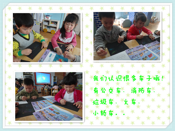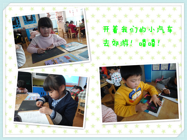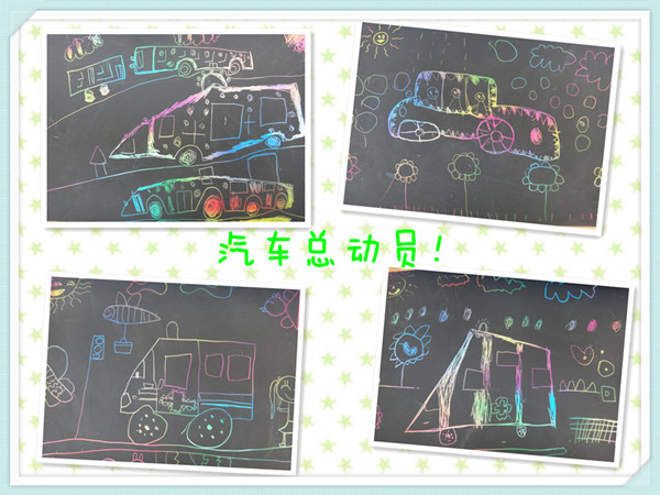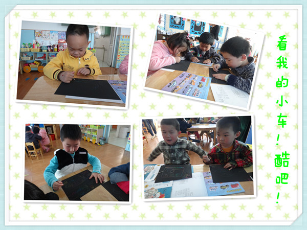 认识了各种各样的汽车以后,我们还和老师一起用刮画纸画出了自己喜欢的汽车!是不是很酷呀!
