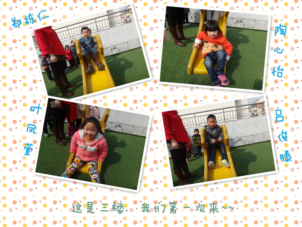 今天天气真好!我和小朋友一起来到三楼的阳台玩滑滑梯。真好玩!