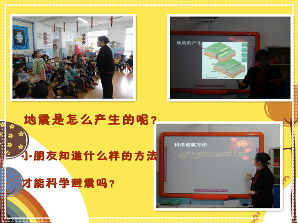 地震是由于地球板块运动挤压而造成的哦!当地震来临时,我们会勇敢面对,不管是在室内还是户外,我们都学会正确的躲避方法啦!