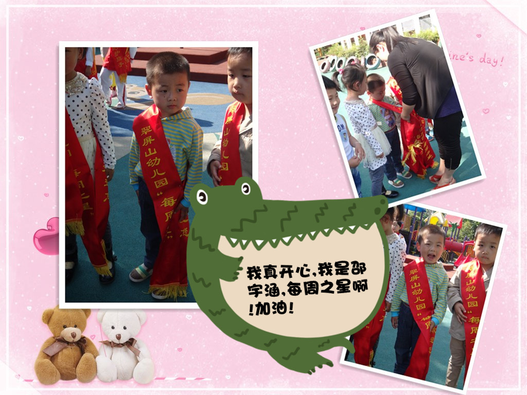十四周和十五周的每周之星新鲜出炉啦!它们是王宁和邵宇涵小朋友!他们在这周表现得很好,都有了很长足的进步!老师希望他们能够再接再厉,成为更加优秀的小朋友!