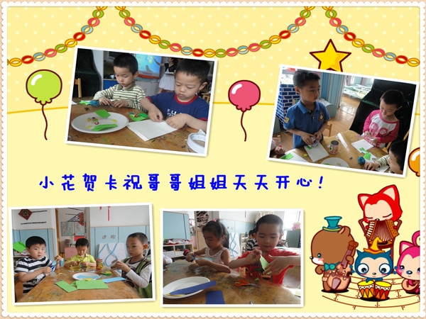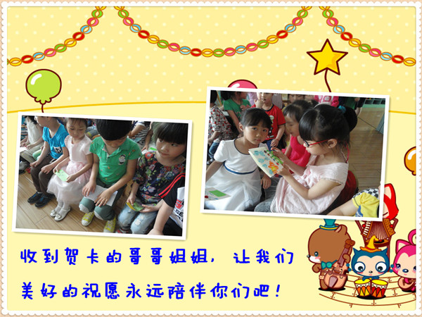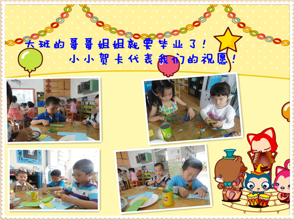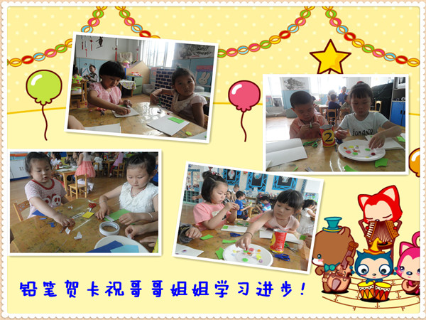 暑假即将到来,大班的哥哥姐姐马上就要从幼儿园毕业,升入小学了,在这里我们中六班的小朋友要给哥哥姐姐们送上美好的祝愿!祝愿他们学习进步!天天开心!我们把这些祝福写在了贺卡上,一会就要去送给他们!