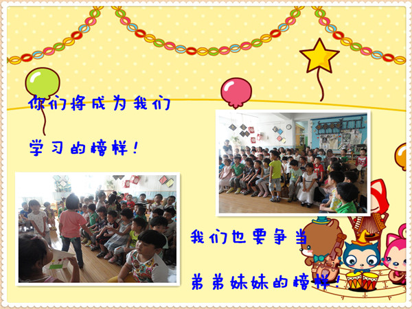 我们也即将升入大班了,就要成为幼儿园里最大的哥哥姐姐,现在,你们是我们学习的榜样!我们要学会谦让,学会学习,学会照顾自己!哥哥姐姐,我们一定会像你们一样,给其他的弟弟妹妹做好榜样作用!