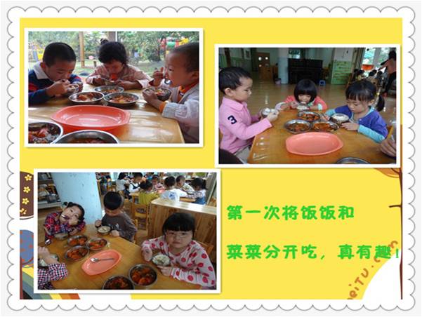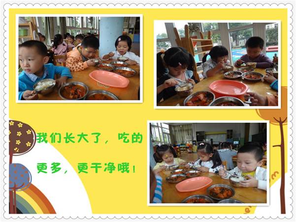 长大的改变 漫长的暑假悄悄过去,转眼宝宝们已经升入中班啦!一切都变得不一样!孩子们带着些许好奇和期待来到了这个新班级!慢慢适应着长大的改变!不如,今天就从进餐开始吧! 看,这是我们第一次将饭菜分开哦!宝宝们一口饭,一口菜的吃着,多香呀!好多小朋友都要添饭呢!长大的宝宝果然更能干了!一起来看看吧!