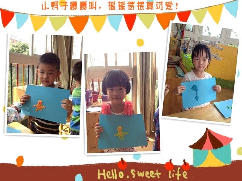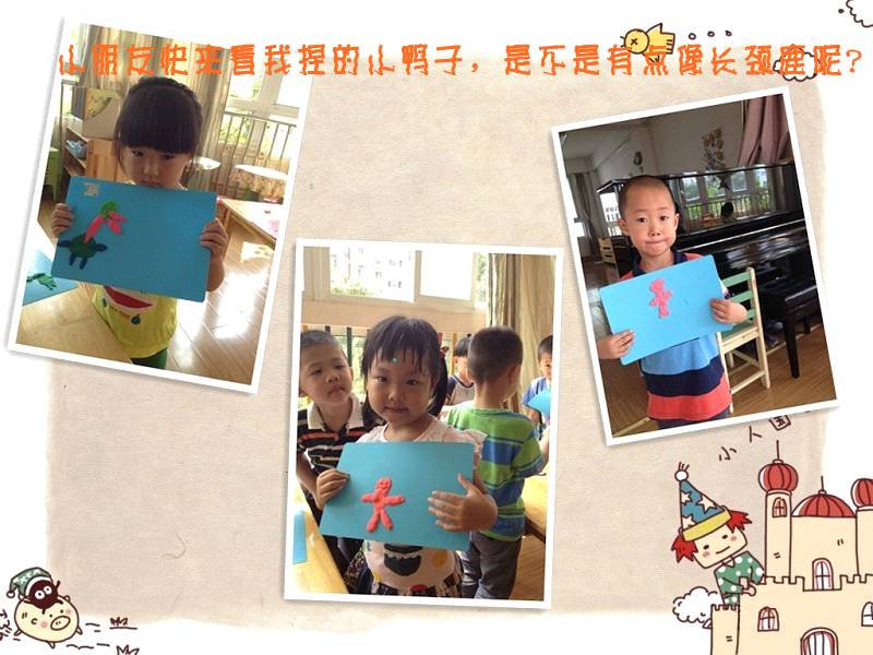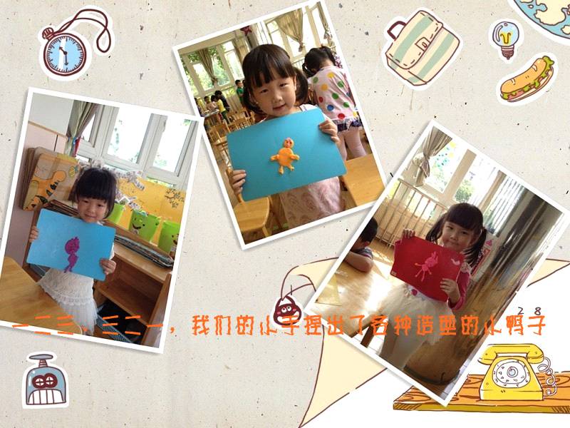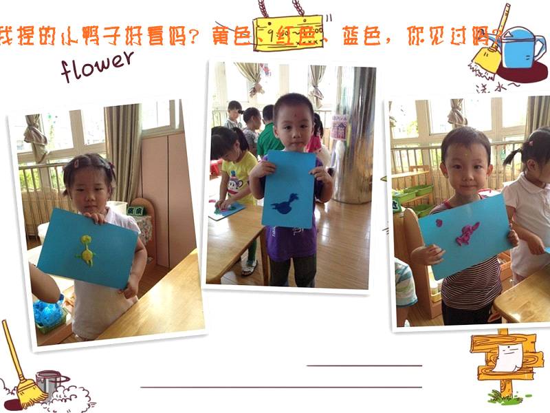 “老师的手,真巧!折只小鸭“嘎嘎嘎”——身子直摇。” “老师的手,真巧!捏只小狗“汪汪汪”——冲我直叫。”