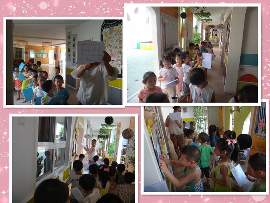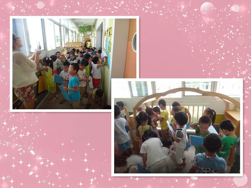 看!我们正拿着画板,跟随着老师一起把幼儿园每一个精彩的角落都用画笔记。