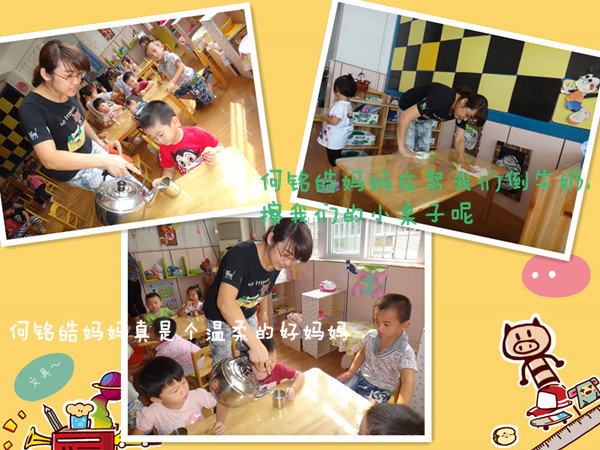 何铭皓妈妈真温柔,何铭皓妈妈帮我们把桌子擦得干干净净的,还帮我们倒牛奶,倒牛奶的时候还提醒我们慢慢喝,小心洒了哦,真是个细心的好妈妈啊~~~