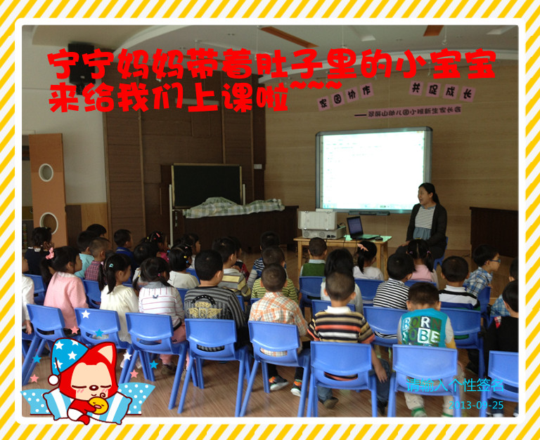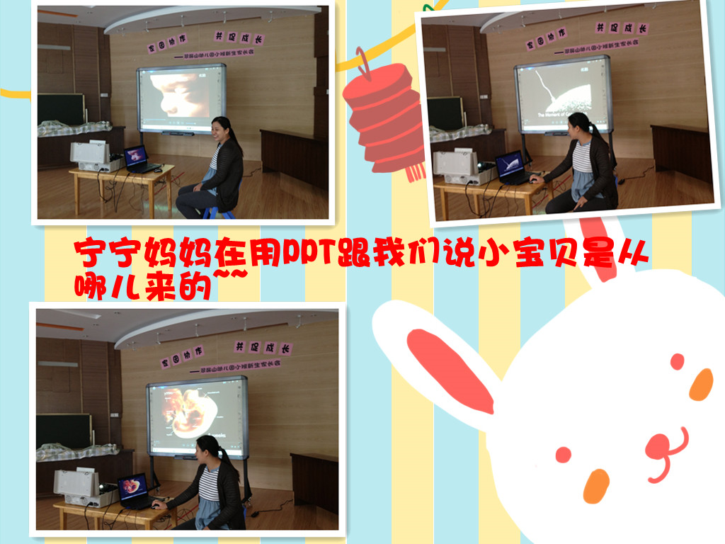今天宁宁妈妈带着肚子的小宝宝来给我们上课啦!!宁宁妈妈告诉我们从爸爸的身体里取一个精子,妈妈的身体里取一个卵子,精子和卵子结合在一起放进妈妈的肚子里,就有了小宝宝。太神奇了!!