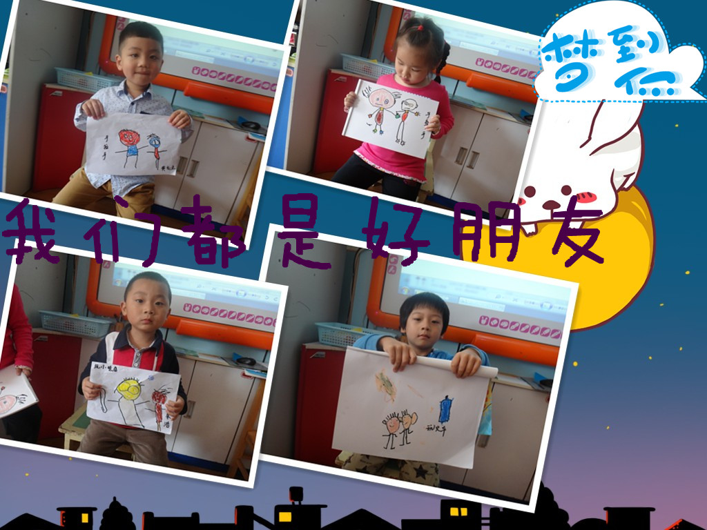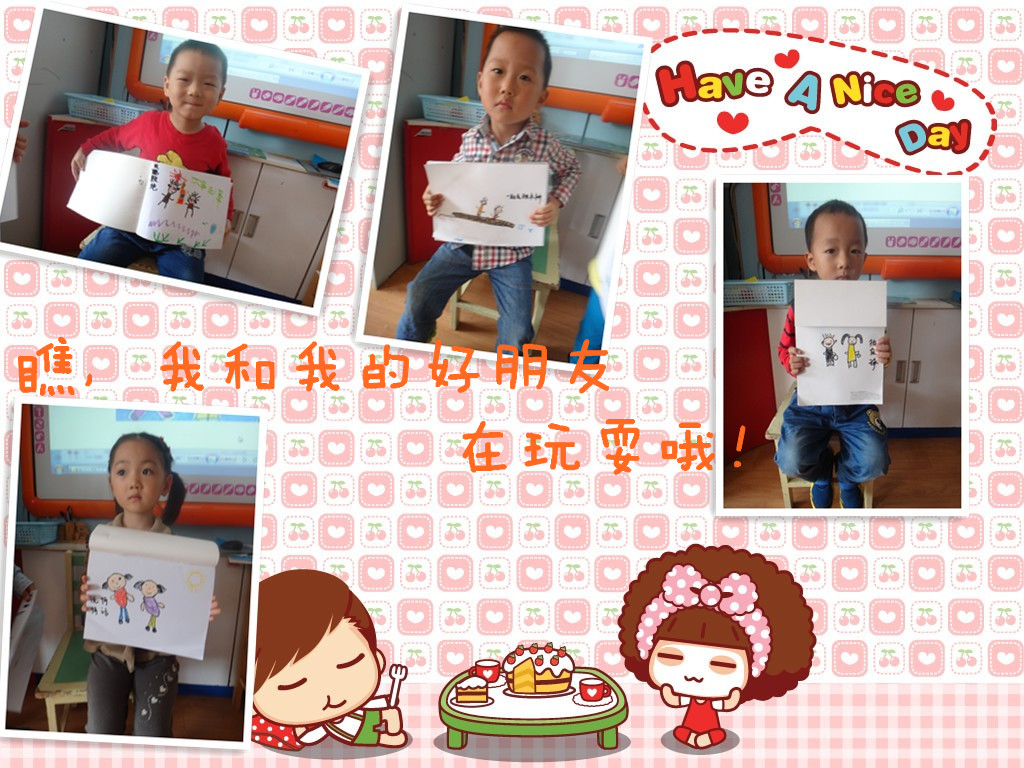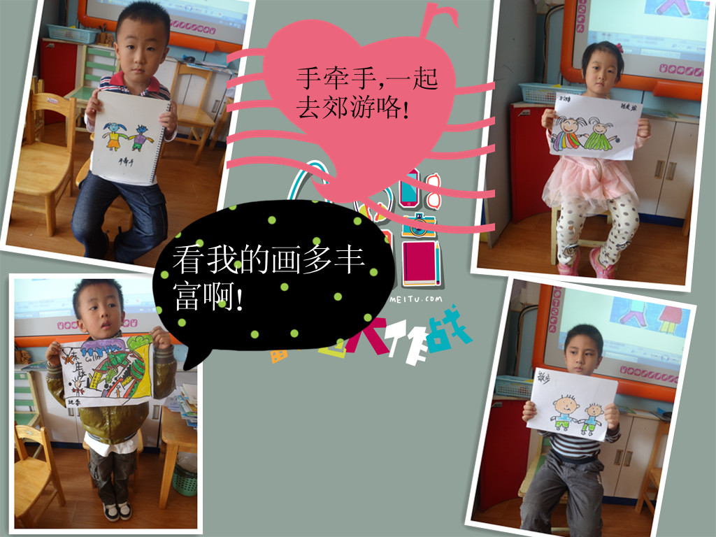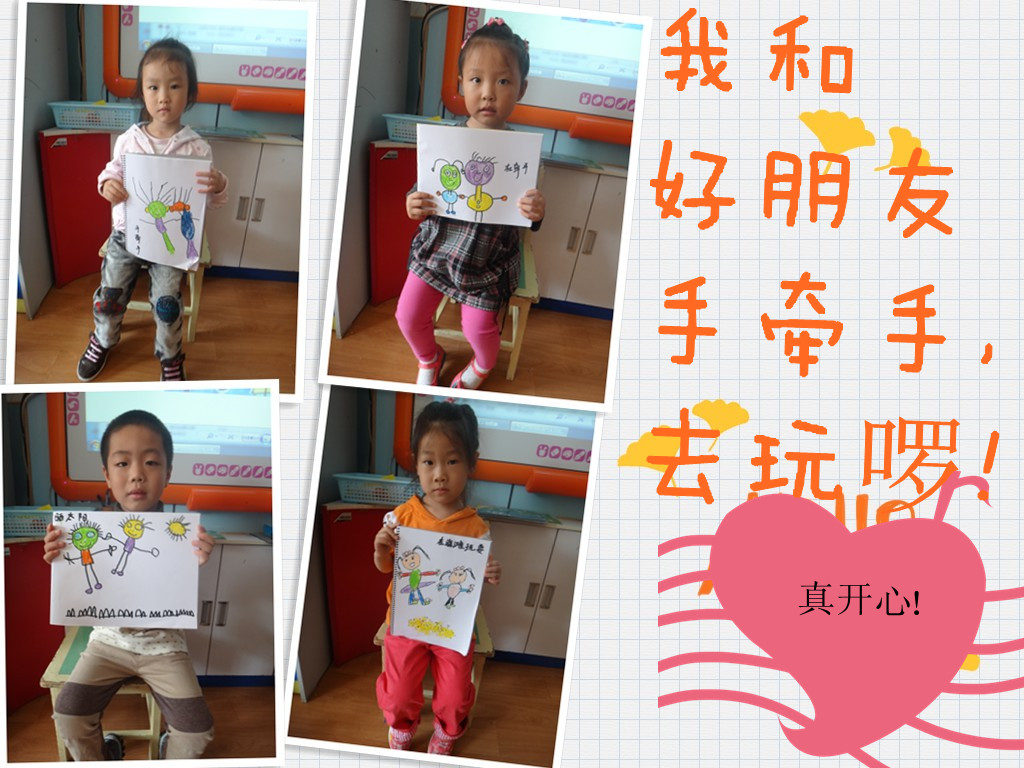 我们每位小朋友都发挥着想象力,把自己和好朋友最喜欢玩的活动给画出来了,有的小朋友画了自己和好朋友一起牵手去郊游;有的小朋友画的是和好朋友一起拍皮球等等。
