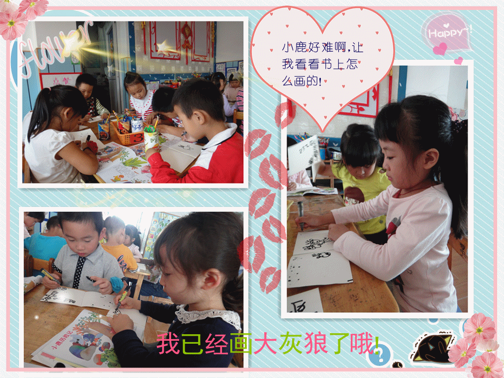 我们画的小鹿可爱吧,不过大灰狼好难画啊,我要想想应该怎