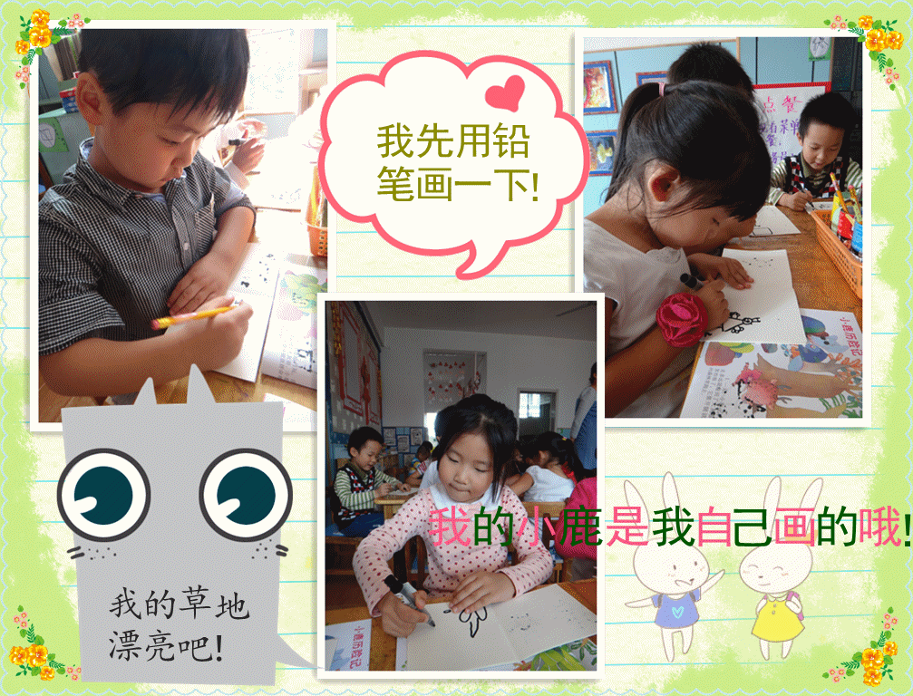 我们还要给小鹿画上美丽的背景呢,我喜欢绿色的草地,我喜欢蓝色的天空,我喜欢茂密的树林哦!