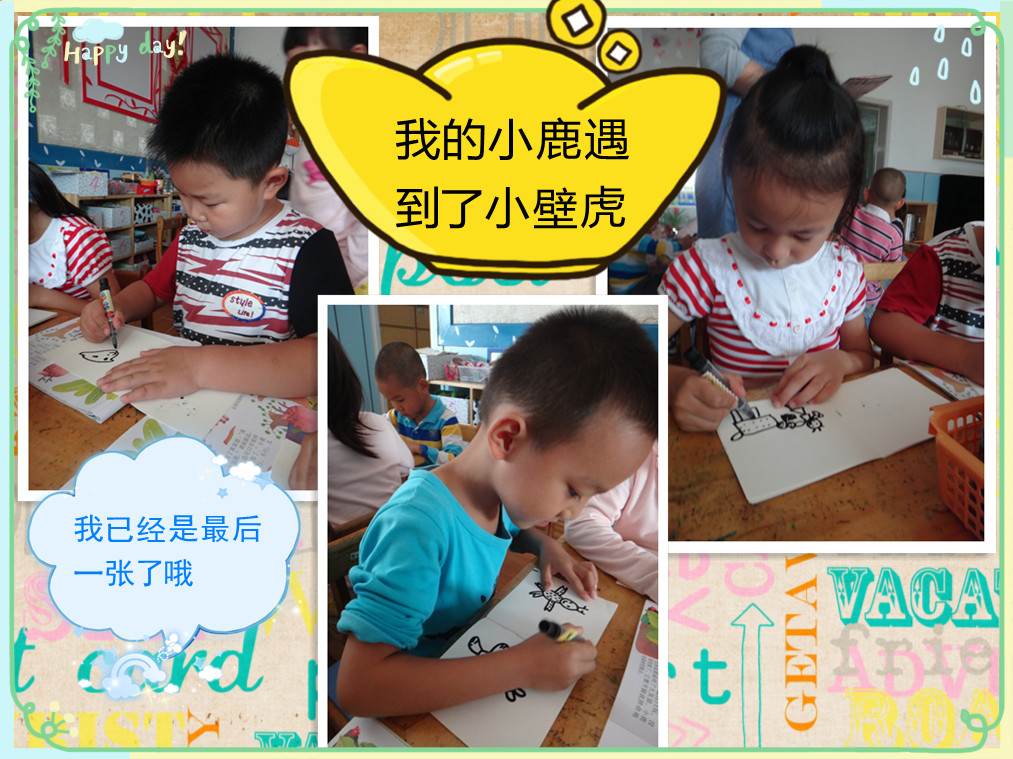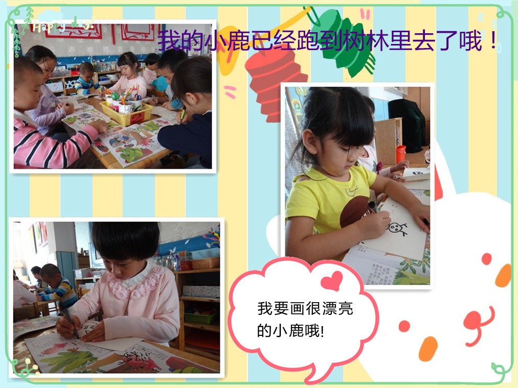 我已经画最后一张了哦,我给老师看了我画的小鹿历险记,老师表扬我画得真棒呢!