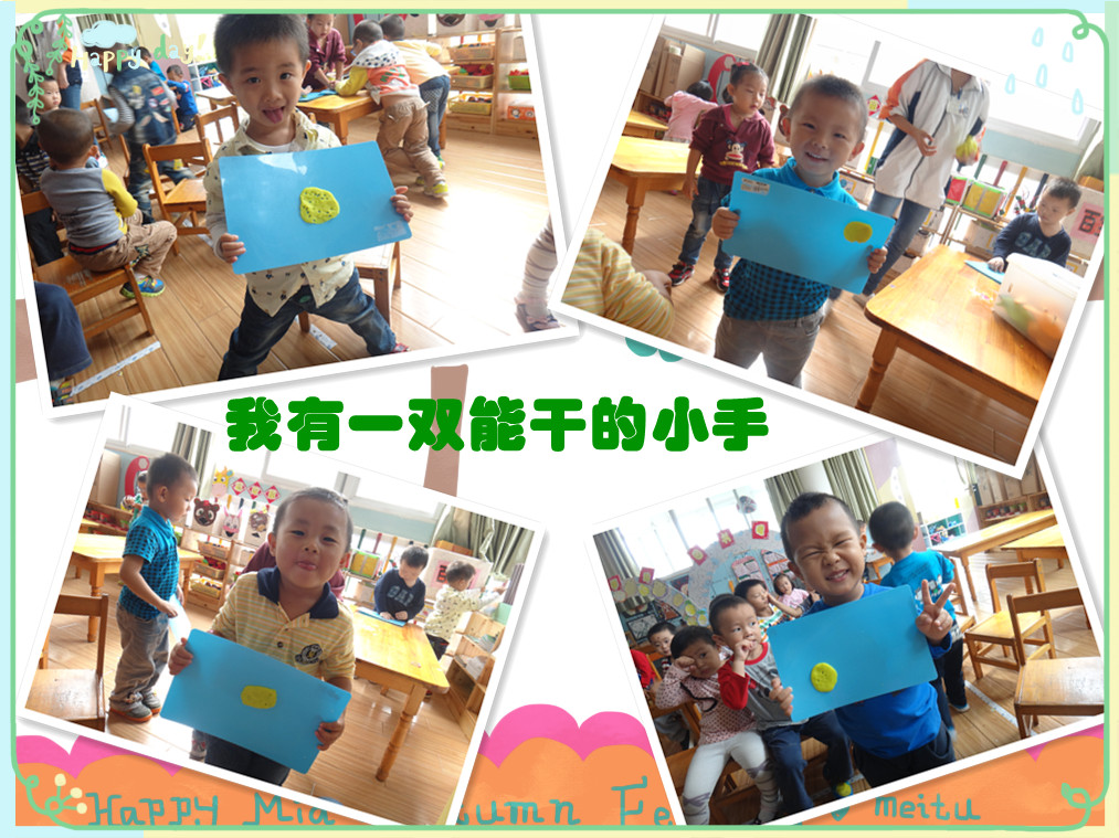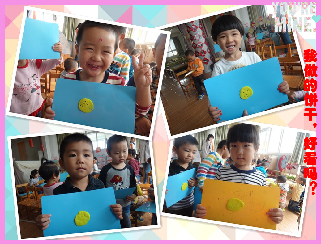 你喜欢吃饼干吗?今天老师带我们玩了做饼干的游戏,瞧瞧我们做的饼干多漂亮呀?哈哈~我们都有一双能干的小手!
