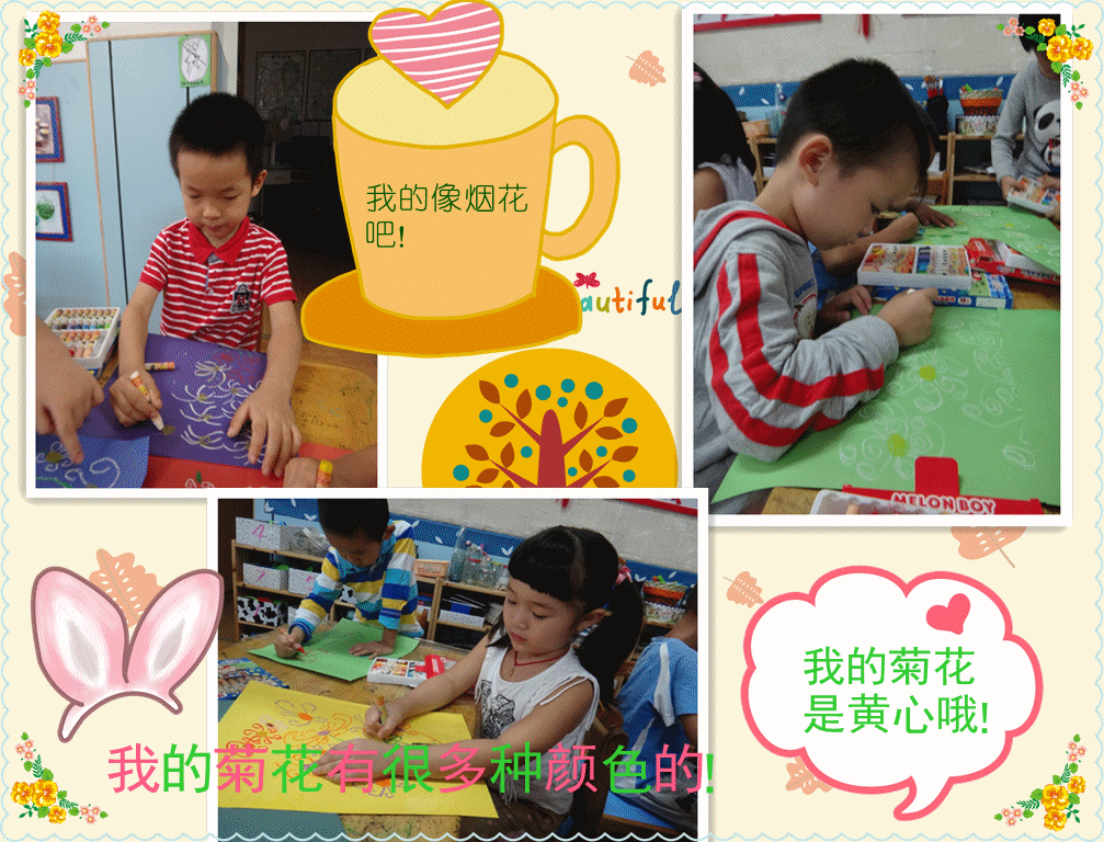 我们很快就完成了美丽的菊花,还欣赏了其他小朋友的菊花,他们都画得好棒啊,老师夸奖我们都是聪明的乖宝宝!