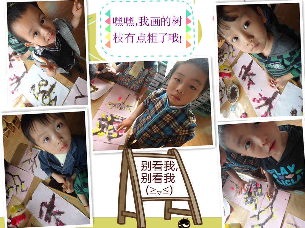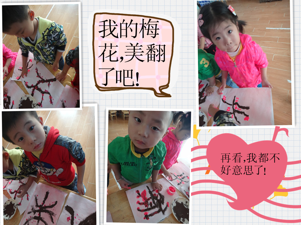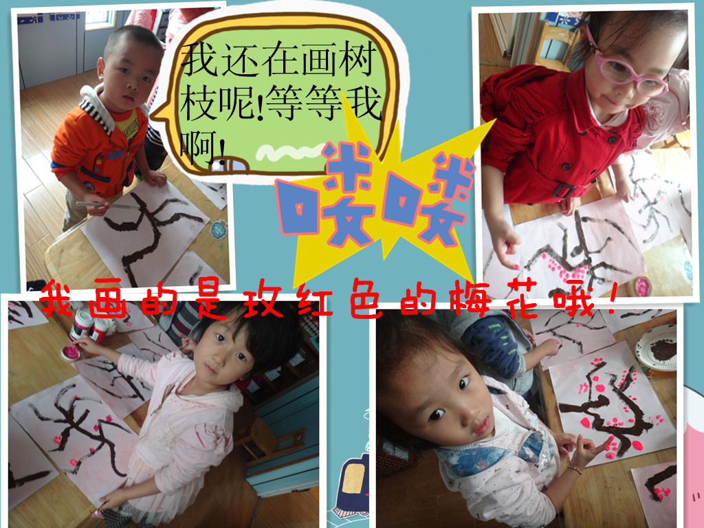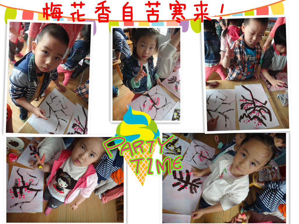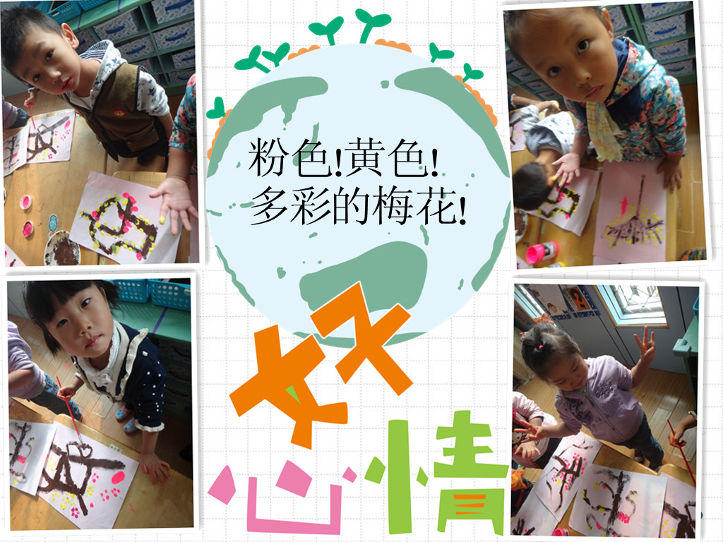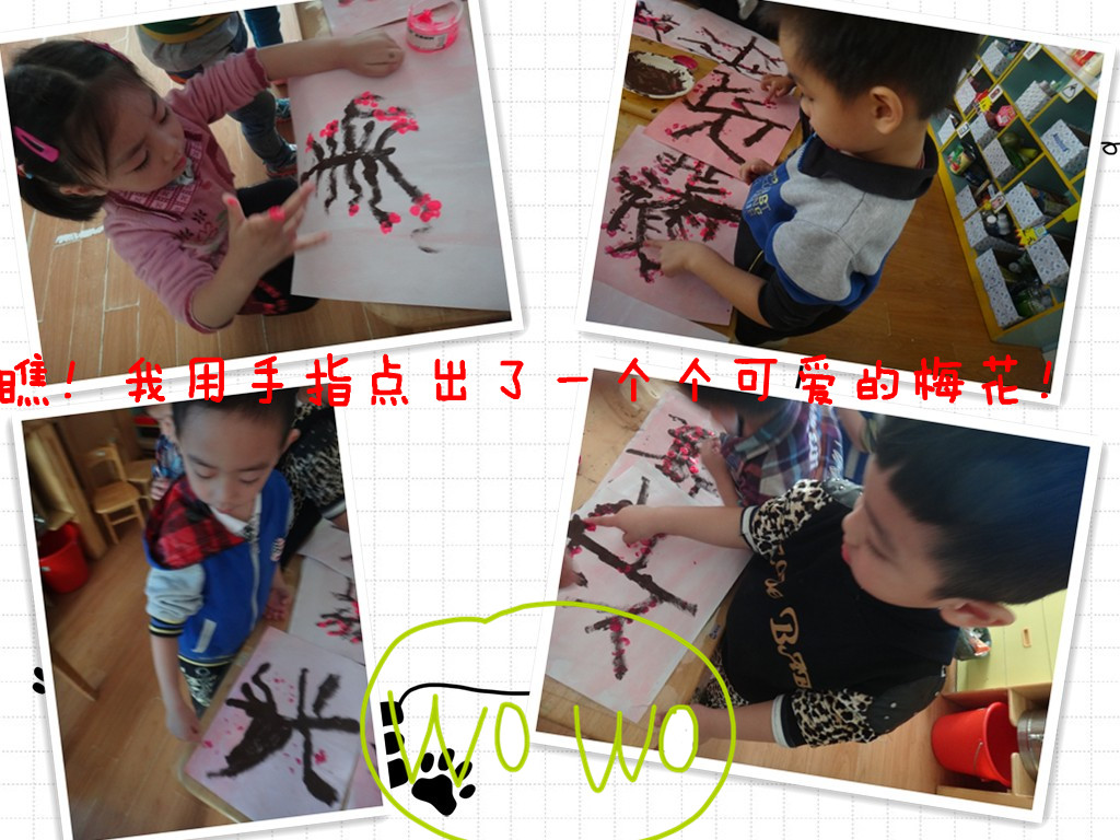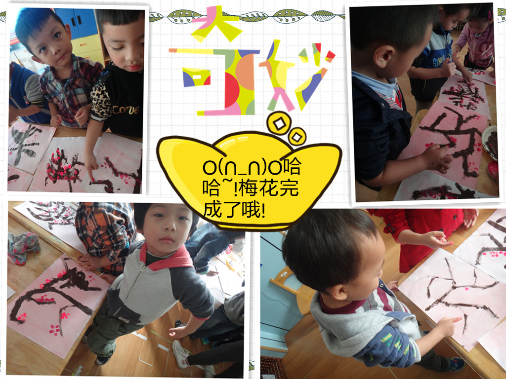 这个星期我们开展了第二次特色活动,上个星期我们凃了梅花的背景色,这个星期我们将延续背景色,用手指点画的方法将梅花一一展现出来!