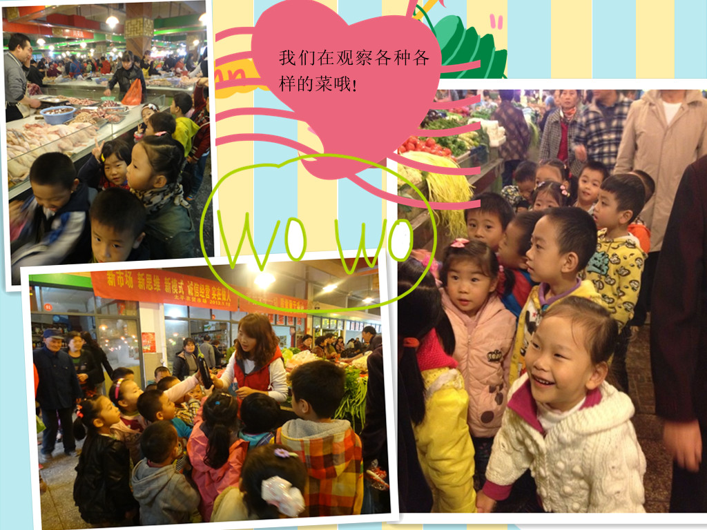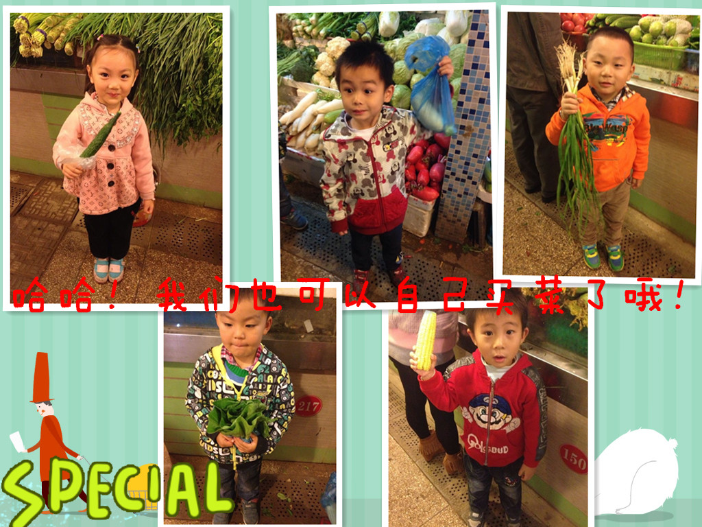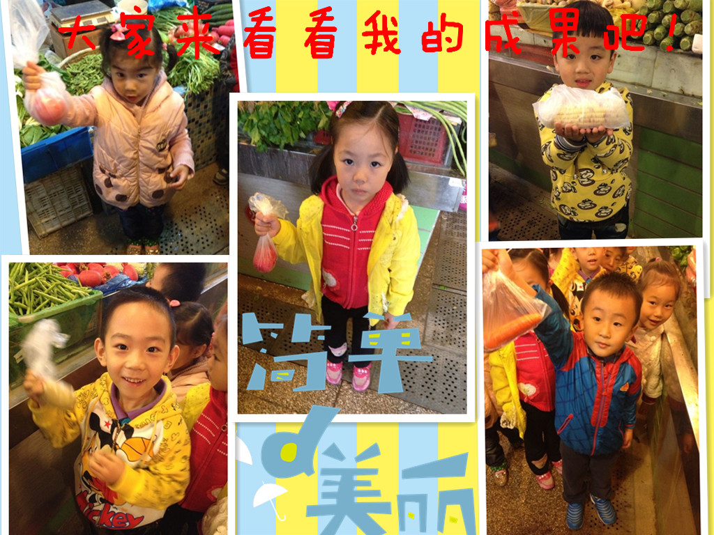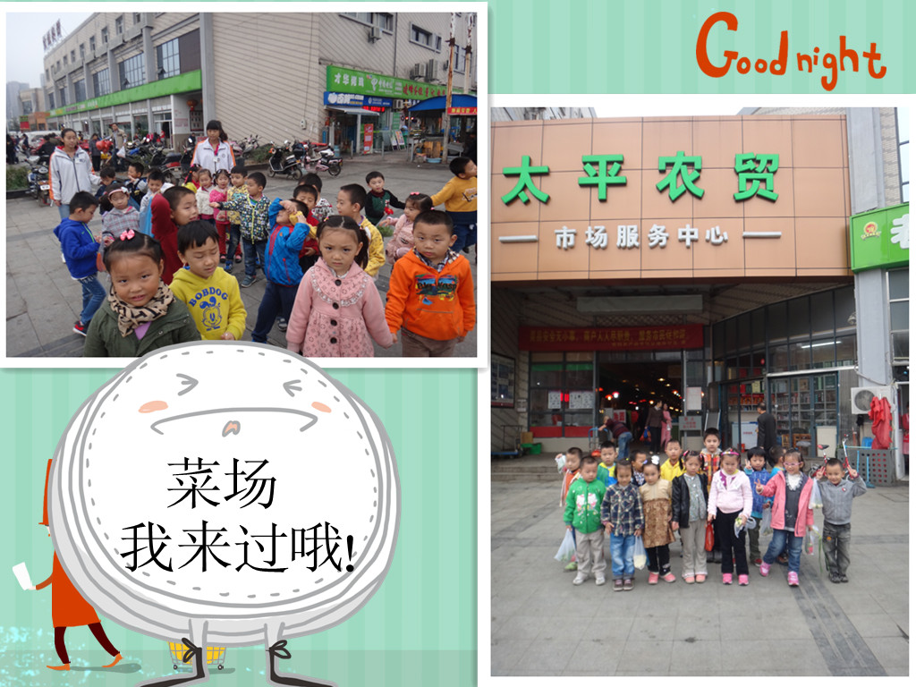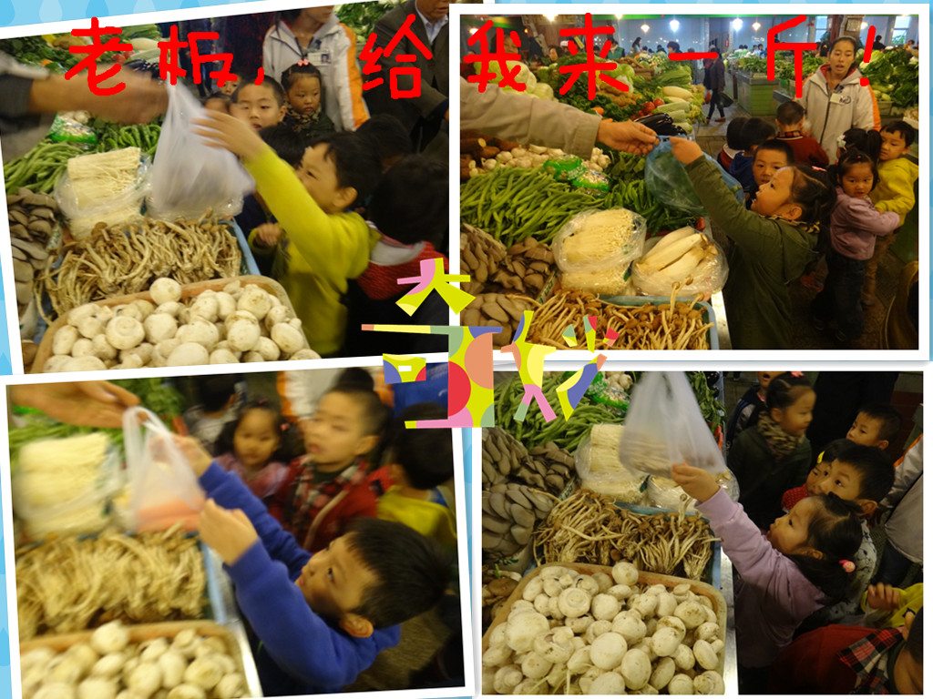 组织幼儿去菜场进行参观,幼儿可以通过直接体验与学习,知道菜场里有很多食品摊位,食品摊位都是分类摆放的;了解卖菜的过程,观察到顾客是怎样买菜的,营业员是怎样卖菜的,她们是怎样说,又是怎样做的;并且能够亲自尝试,用自己带的两元钱买回自己想吃的菜,体验一下怎样买菜。