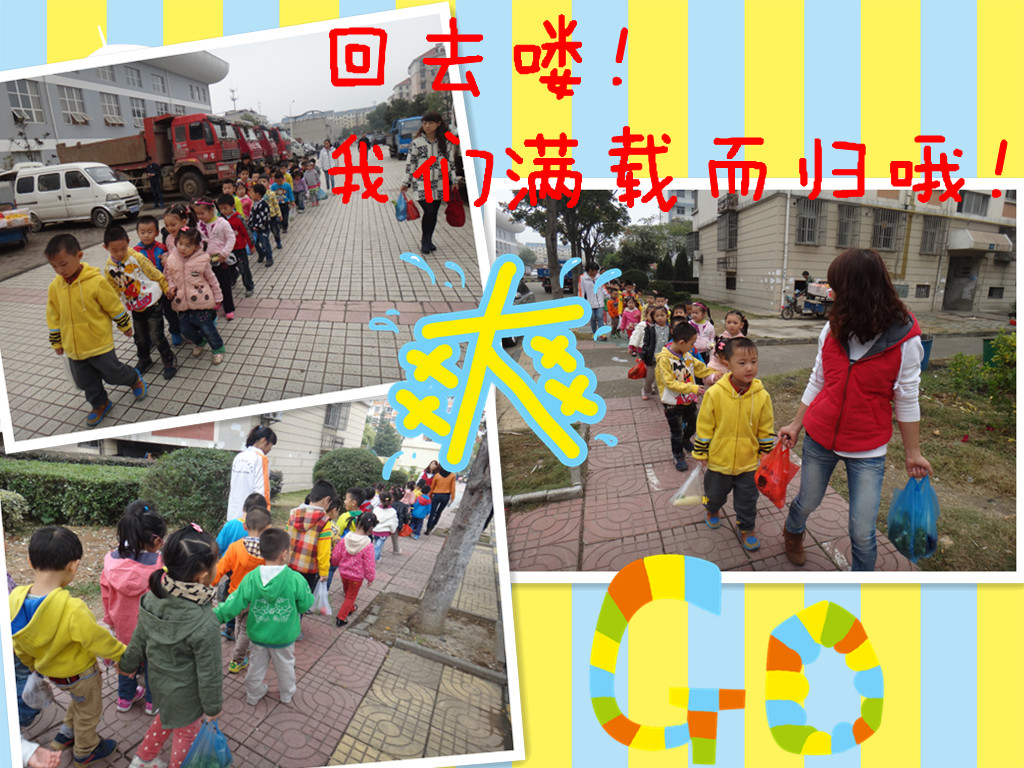 我们拎着自己买的菜,排着队,回幼儿园喽!