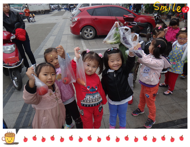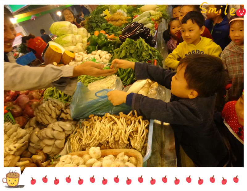 最精彩的就是“买菜”喽,在老师现场买菜示范后孩子们迫不及待的拿着2元钱,根据自己的买菜计划,分小组购买自己心仪的蔬菜,有的竟然还大胆和摊主叔叔阿姨们讨价还价,很快大家都满载而归。回园后,各班老师们又组织孩子们从颜色、形状、气味等方面分享了自己所买的菜,还让孩子们分组清洗并动手制作了一份丰盛的“蔬菜拼盘”。