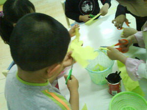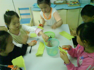剪的纸屑要放到篓子里。 看我剪得多认真!