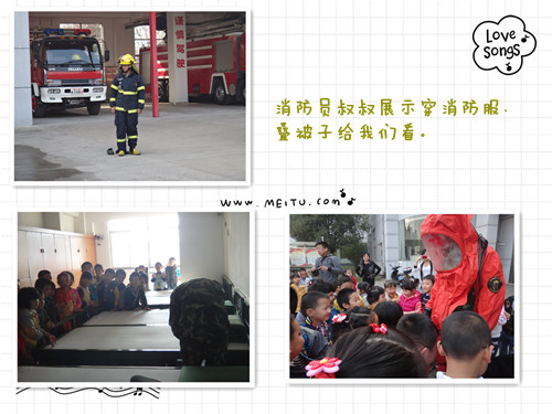 9:10——消防员叔叔们给我们展示了三种不同的衣服,并介绍了它们的不同作用是什么。接着,我们参观了消防员叔叔睡觉的地方,他们的被子叠得真整齐,我们要好好向他们学习。再接着,消防员叔叔给我们介绍了消防车的小知识,我们收益颇丰呢!谢谢消防员叔叔。最后,消防员叔叔给我们展示了消防车上云梯的升降,云梯能伸展到很高的地方,这样更加方便救援。