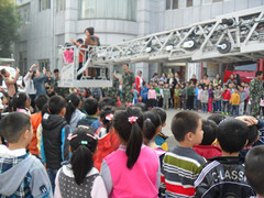 首先,小朋友们参观了消防员的宿舍,看到消防叔叔被子叠得整整齐齐,床单平平整整,都露出来敬佩的的目光;接下来观看了消防叔叔从“铁柱上”滑下来快速穿好衣服,这让小朋友对消防叔叔更加的崇拜;消防叔叔还邀请了部分孩子登上云梯,让小朋友们兴奋不已。最后消防叔叔带着小朋友们参观了消防车、消防配件、器材车,并结合小朋友的生活经验,介绍了失火的简单自救方法。