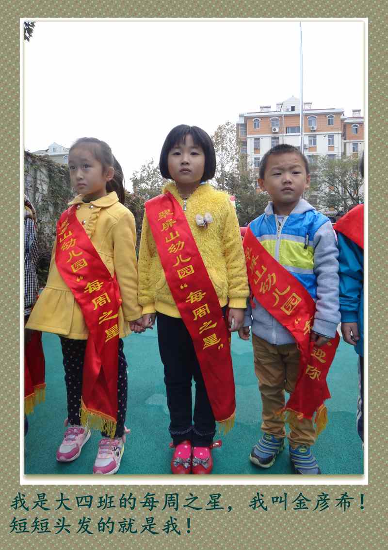 嗨,大家早上好!我是南京市江宁区翠屏山幼儿园大四班的金彦希小朋友,我是第十周的每周之星哦!下面我来介绍一下自己吧!