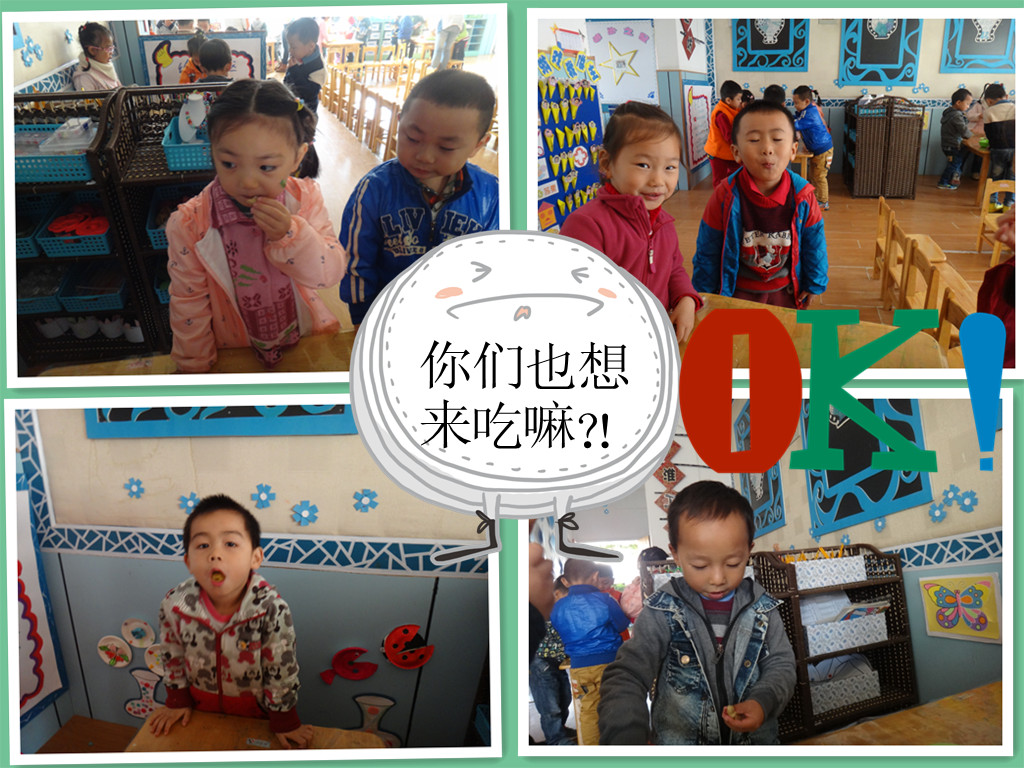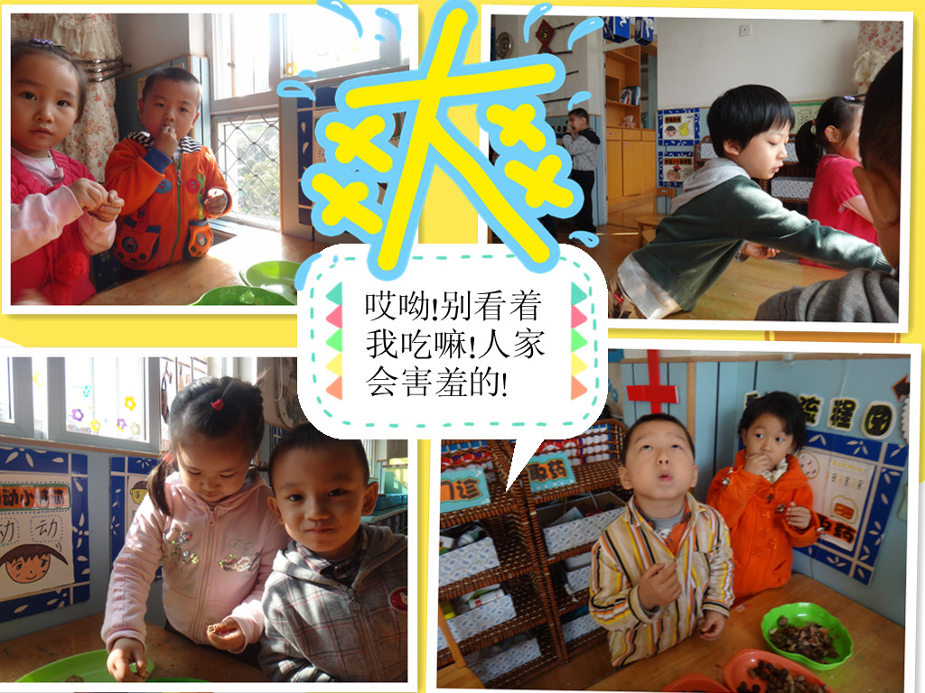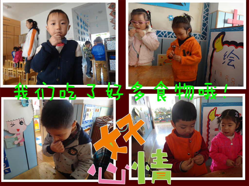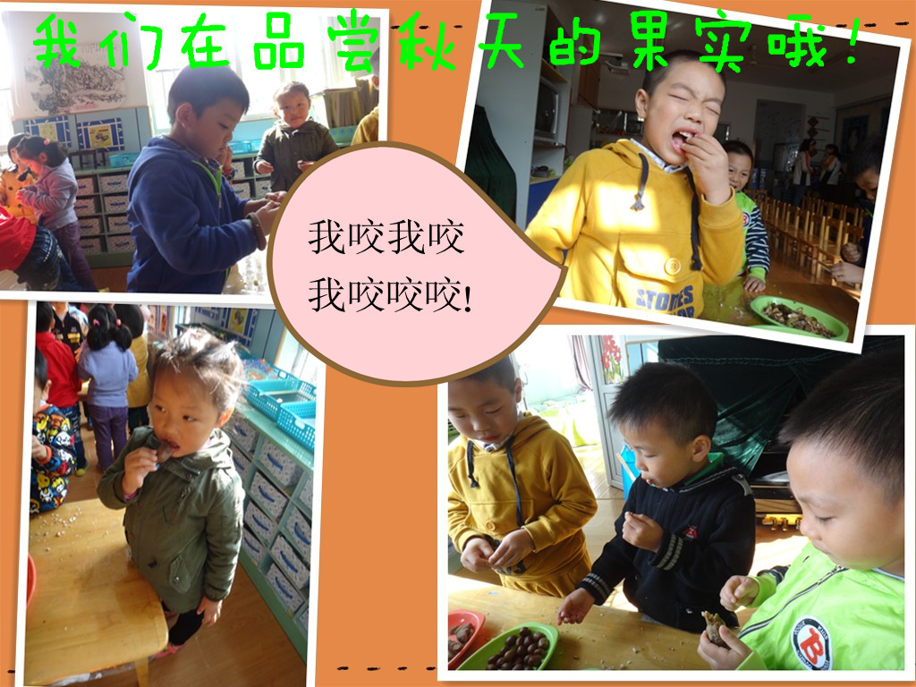 小朋友们一起分享着各自带来的秋天的果实,共同体验丰收的快乐心情!