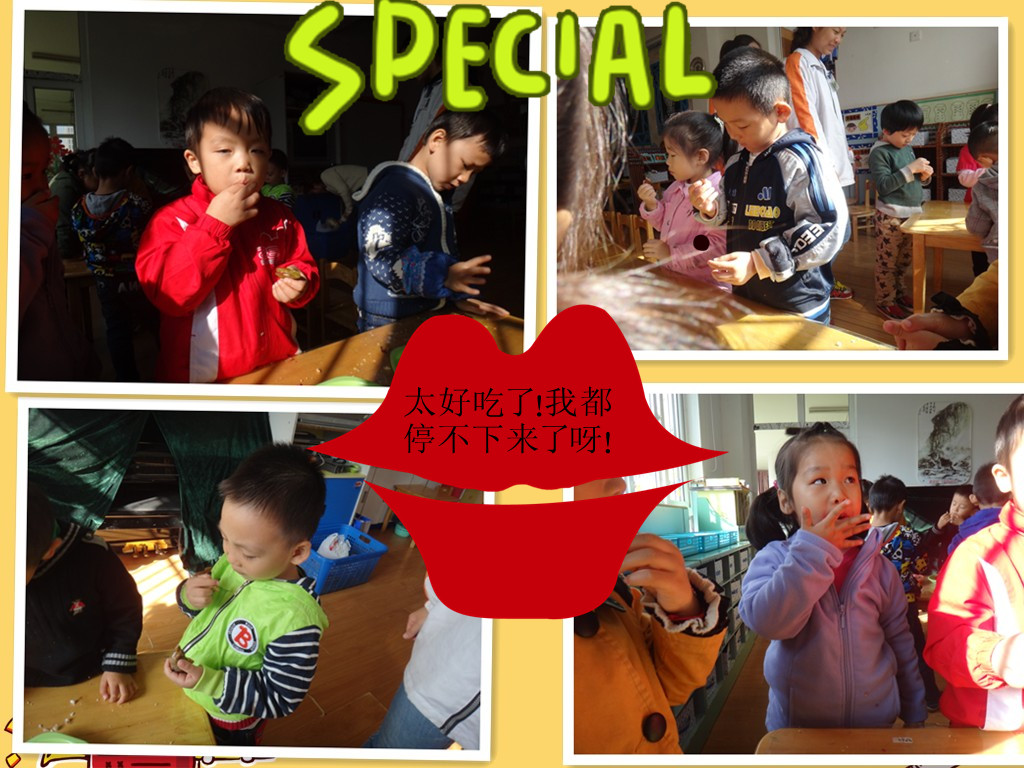 今天我们班举行了一场庆丰收的品尝会!小朋友们带来了各种各样的秋天的果实,比如:板栗、菱角、花生、毛豆、红薯等。