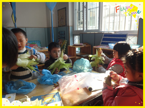 大家一起把玉米的“外衣”扒掉,哎呀!怎么这么紧?老师快来帮帮忙!看来掰玉米不是一件简单的事!