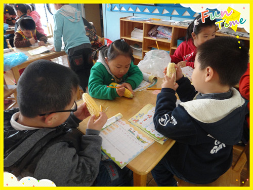 大家一起看看玉米的胡须,真有趣!老师告诉我们,玉米须还可以做中药哦。玉米粒一粒一粒排的好整齐,我们排队也要向它们学习才行。