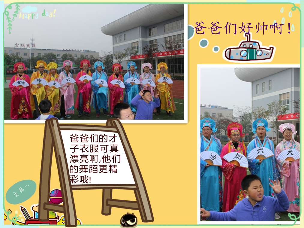 瞧,爸爸们待会要表演才子的舞蹈啦,他们的衣服漂亮吧,好想看他们的表演哦!