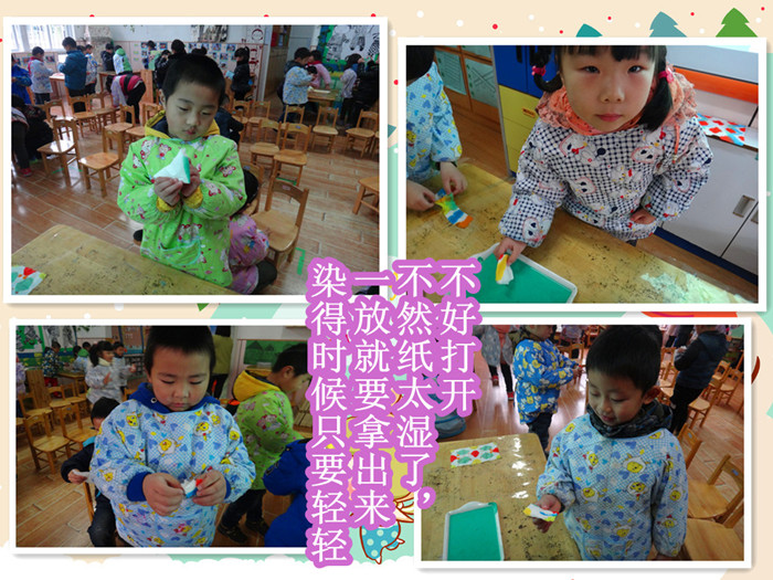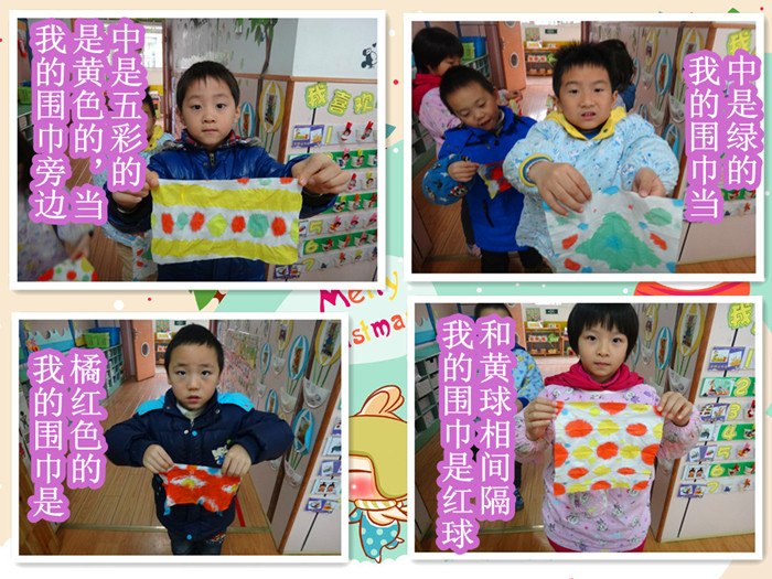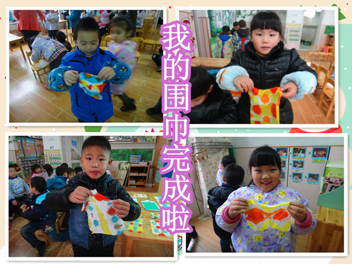漂亮的围巾 冬天到了,我们都带起了围巾。今天我们要自己动手设计、印染一条属于自己的围巾。老师给我们准备了黄色、绿色、橘色、红色等各种颜色的颜料,我们自己准备了纸巾,准备开始。 我们自己的围巾完成了,有各种各样的,老师夸我们都很能干。 |