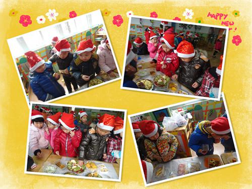 接下来,当然是圣诞PARTY的重头戏——美食分享会啦!爸爸妈妈准备的美食也是丰富多彩,美味不容错过哦!有水果沙拉、华夫饼、笑脸蛋糕、春卷、小肉圆、水饺、南瓜饼、水果拼盘等等,看得我们眼花缭乱,吃得我们开心极了,真心地谢谢我们的妈妈。