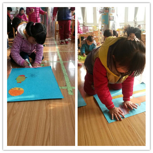 瞧我用胶棒把小鱼黏贴在海底世界,希望它们自由自在的在海里游来游去!