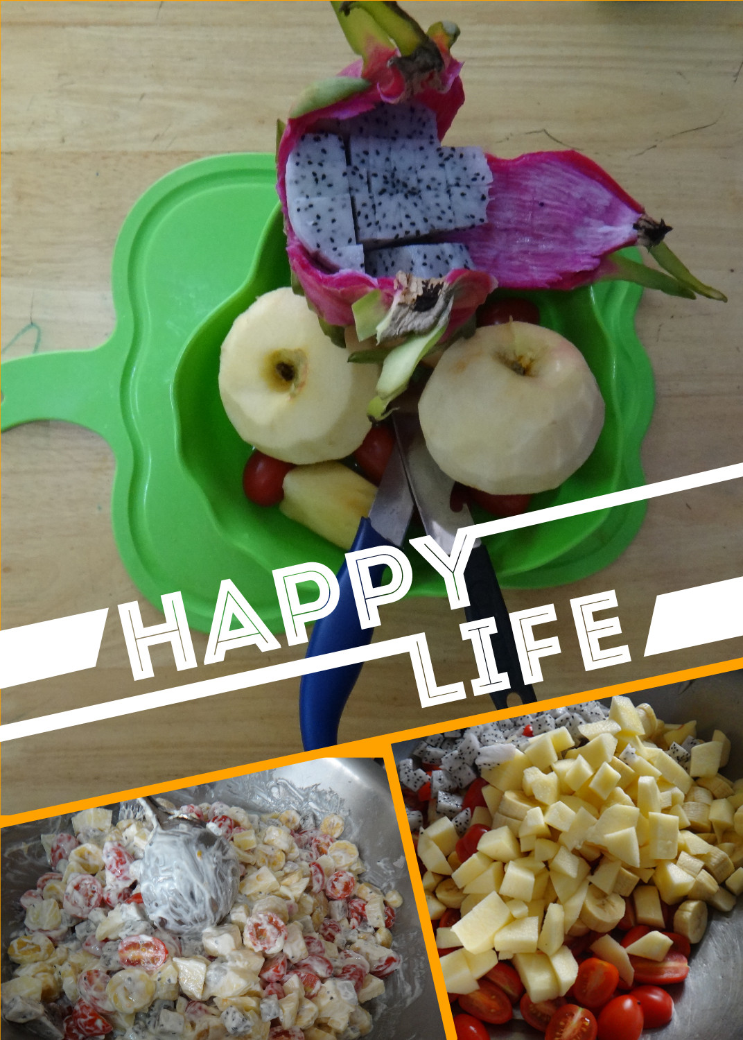 香蕉、苹果、火龙果、小番茄,再加上美味的沙拉酱,这是水果沙拉的必备材料。