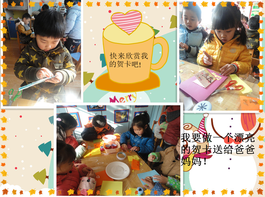 我们现在是小小设计师哦,我们要亲手制作新年贺卡送给爸爸妈妈,还请老师帮我们写上祝福语了哦,好想给他们一个惊喜哦!
