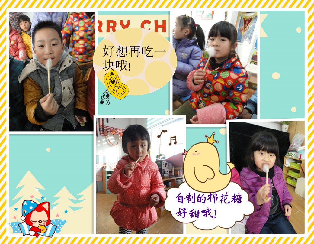 为了奖励我们包饺子包得特别棒,老师现场制作了棉花糖送给我们哦,甜甜的棉花糖可真好吃,可是不能吃多哦,会咳嗽的,我只吃了一点点哦!