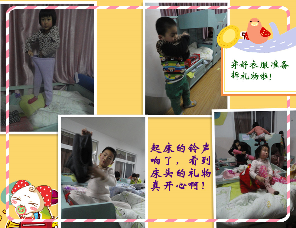 起床的铃声响了,第一眼看到的是新年礼物,老师告诉我们这是爸爸妈妈夜里送给我们的,好开哦,赶紧穿好衣服去拆礼物了!