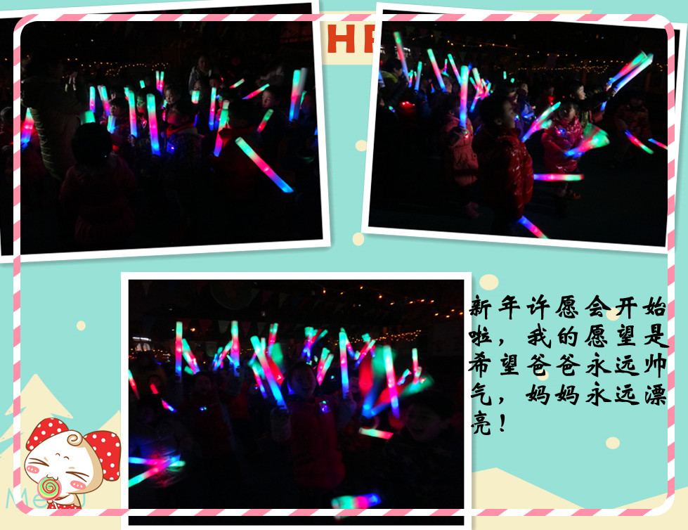 新年许愿会开始啦,我们的荧光棒很亮吧,我们要许愿了哦,希望爸爸永远帅气,妈妈永远年轻漂亮。