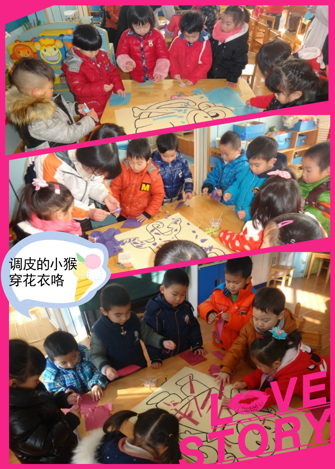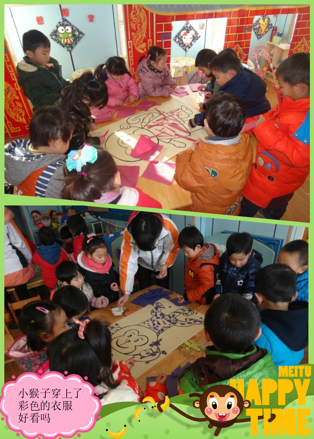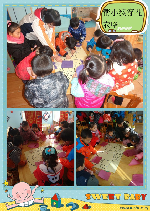 特色活动:调皮的小猴 12月27号,这次美术特色活动中,老师请宝宝们动手玩了一次撕纸粘贴的活动。活动的内容是准备了几张不同造型的猴子的图片,宝宝们在感知小猴子的外貌、生活习性的基础上,让宝宝们对小猴子产生喜爱之情。之后在讲解示范过撕彩纸帮小猴穿花衣的操作以后,宝宝们开始小组合作很认真的帮可爱的小猴子身体贴上彩纸穿上彩色的衣服。每位宝宝们都能够大胆的撕纸帮小猴装饰上好看的衣服,同时在这次活动中宝宝们也体验到了撕纸粘贴的快乐!