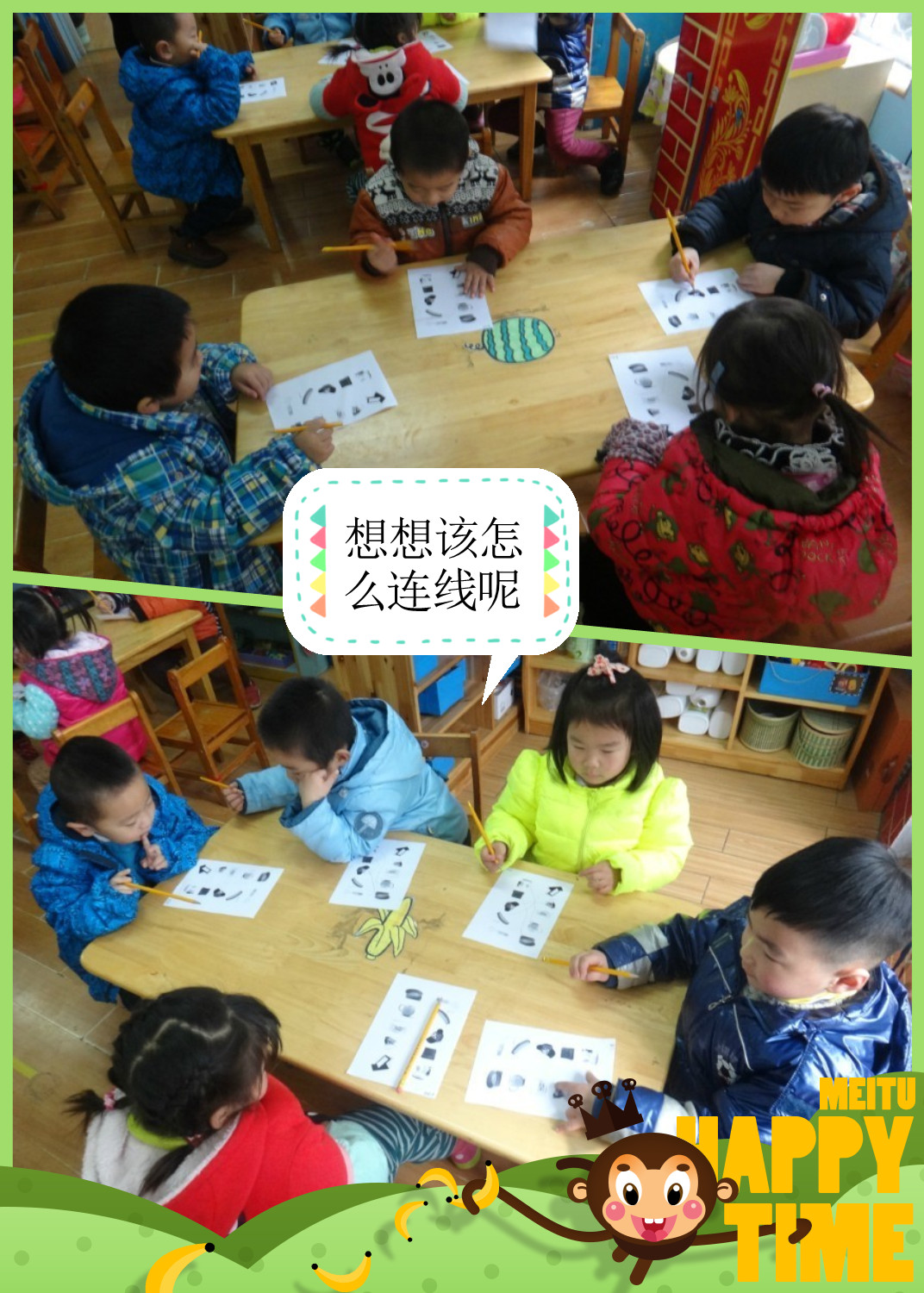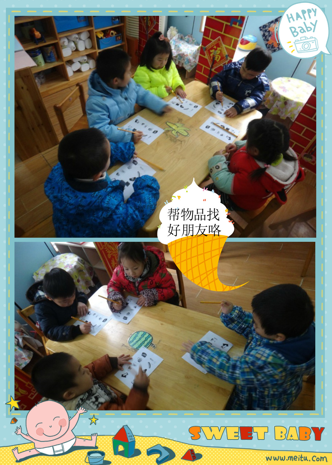 数学活动:找找相关的 2014年1月7号,孩子们给冬天的一些生活物品来找好朋友啦!老师引导宝宝们说一说围巾、梳子、碗、茶杯等物品的好朋友。等宝宝们学会了帮物品找相配的好朋友以后,就开始再操作纸上拿笔将两个好朋友连在一起。宝宝们很棒最后都把两个好朋友连在一起了。下面我们一起去看看宝宝们认真操作的样子吧!