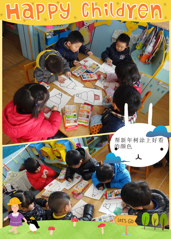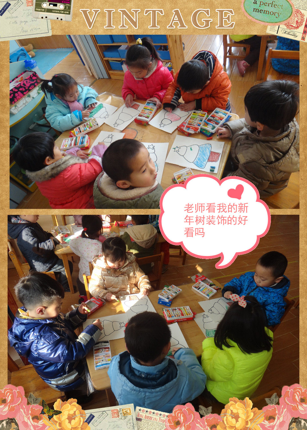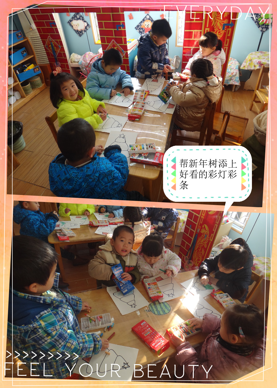 美术活动:新年树 1月10号,我们班开展了美术活动,这学期即将结束,新年即将到来,结合新年的主题,我们开展了一次涂色装饰新年树的活动,每位宝宝都拿起画笔在画纸上涂色,装饰出了属于自己的一颗五彩的新年树!并且宝宝们拿起自己喜欢的颜色给自己的新年树装饰上好看的彩灯和彩条,一下子一颗颗发着光的新年树就诞生啦!下面我们一起去看看宝宝们的杰作吧!