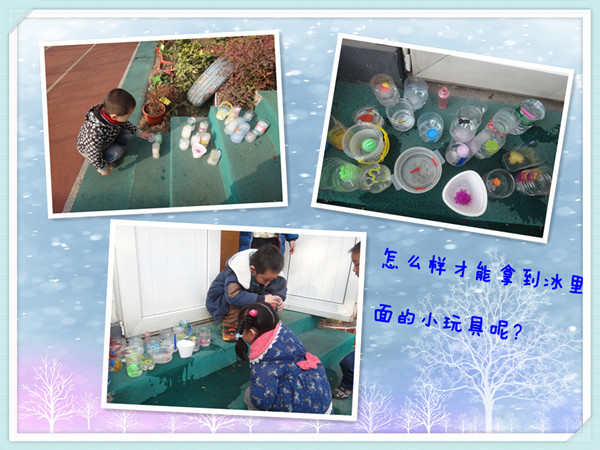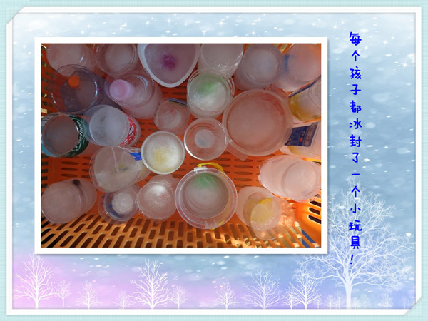 冬天是冰雪的世界,今天我们举行了主题活动《好玩的冰》,老师请每个小朋友都带来了一块里面封着小玩具的冰块。怎么样才能拿到冰块里的小玩具呢?小朋友们积极开动小脑筋,想出了各种各样的方法,一起来看一看!