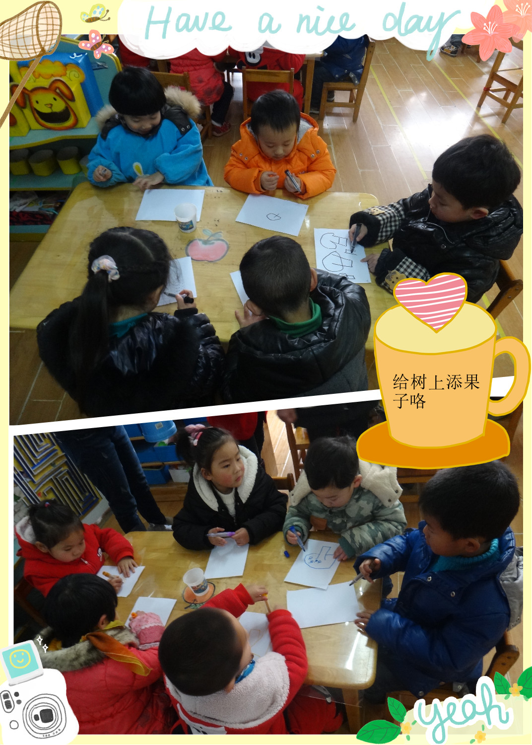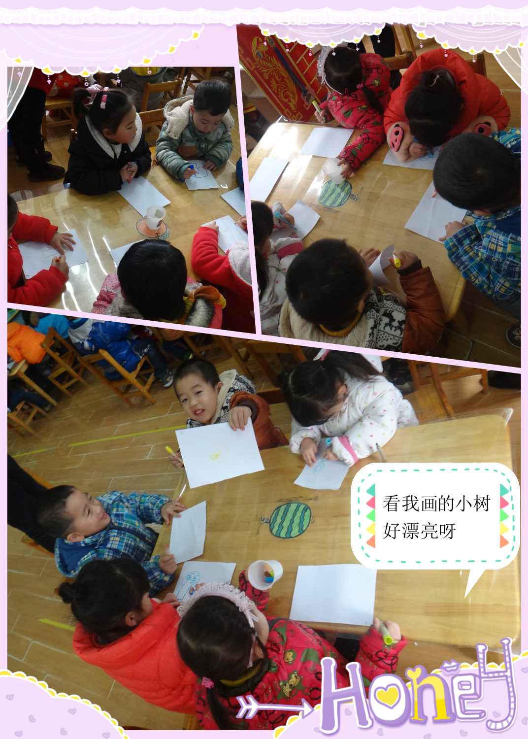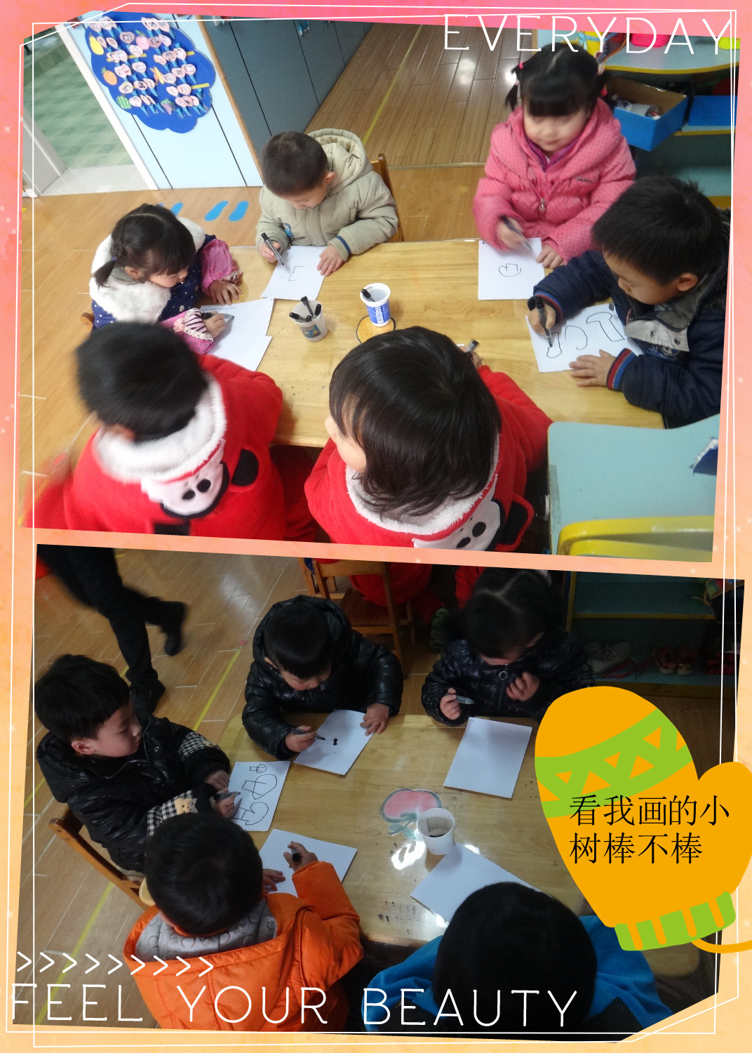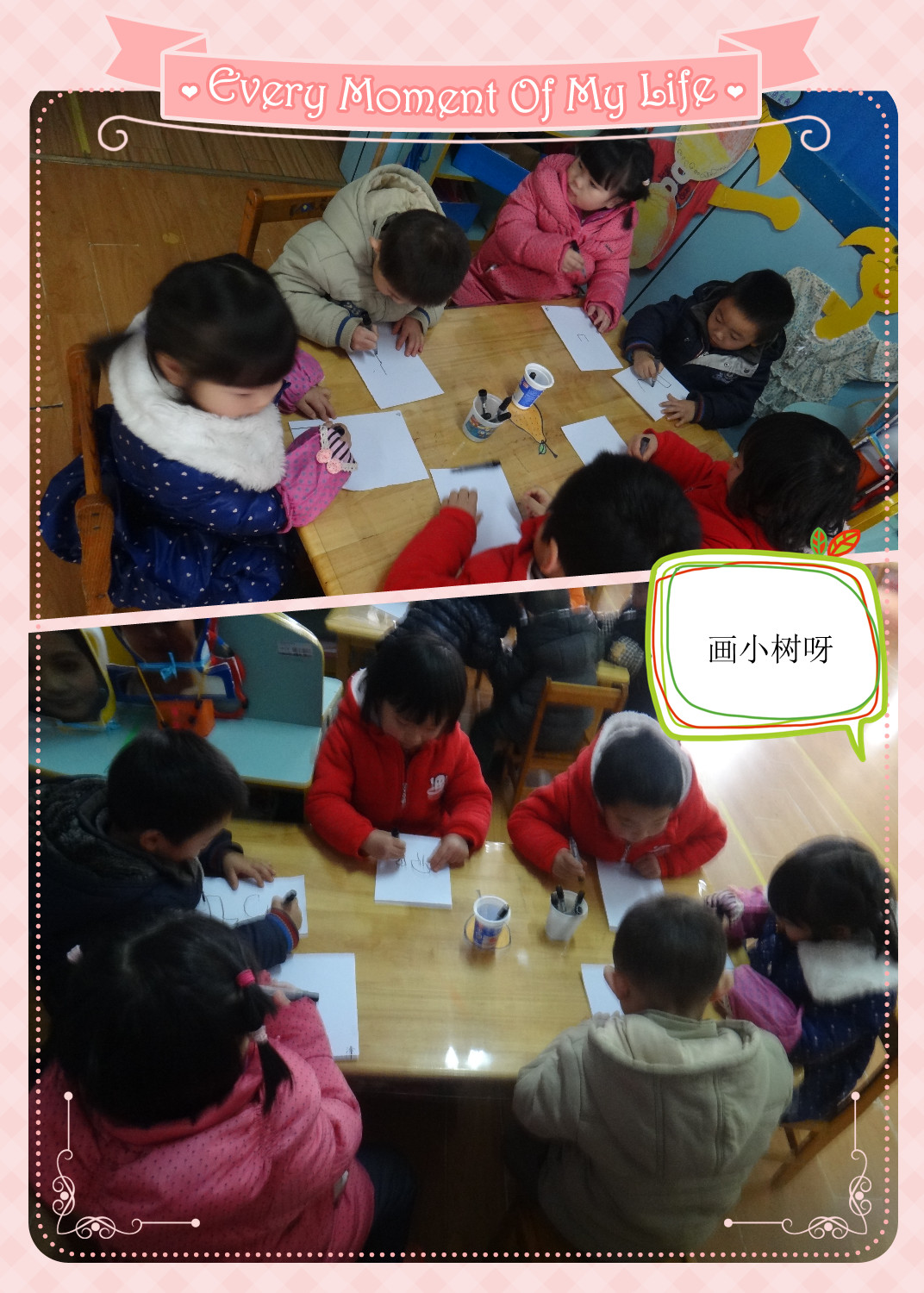 冬天的树 1月13号,我们请宝宝们在纸上面用简单的线条来画冬天的树。在画之前,老师用最简单的线条和方法示范了冬天的树的画法。宝宝们掌握了画树的方法和步骤以后拿起了笔开心的画起了各种形状的树。有的宝宝还用简单的线条画出了一个个小果子呢。下面我们一起去看看宝宝们的开心画画的样子吧!