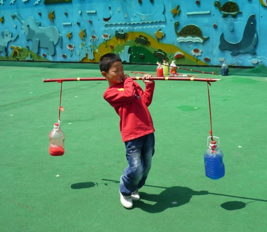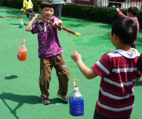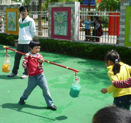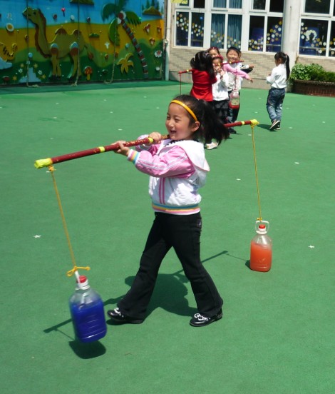 扁担也是有用的工具,过去人们喜欢用扁担挑运物体。挑过山,挑过水。篮筐装满幸福,扁担一肩挑。今天我们也用扁担,挑满着喜悦!
