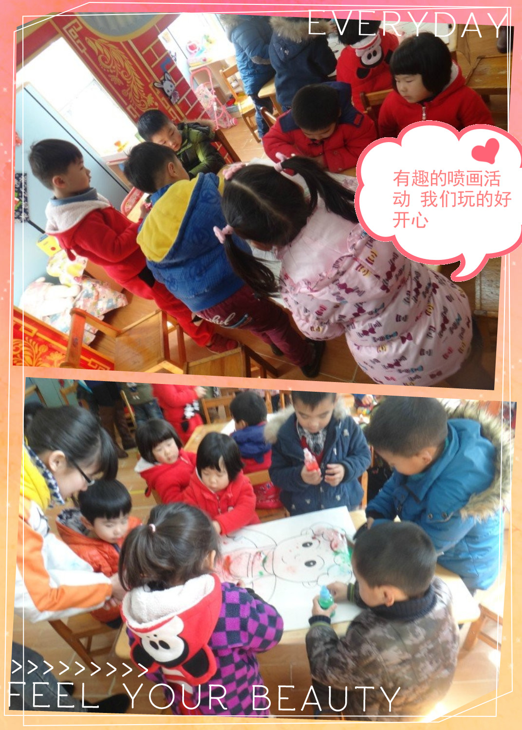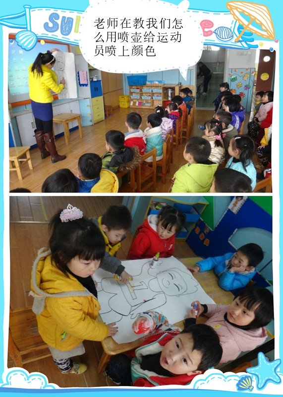 今天的美术活动是结合今年南京青奥会的主题,为运动员喷上好看的服装颜色。老师让宝宝们欣赏过一些运动员的服装和颜色后,还让宝宝们了解跟这个运动员有关的运动项目,扩展宝宝们的已有知识经验。第一次接触以喷画形式的玩色彩活动宝宝们都很感兴趣,下面让我们一起去看看宝宝们开心作画的样子吧!