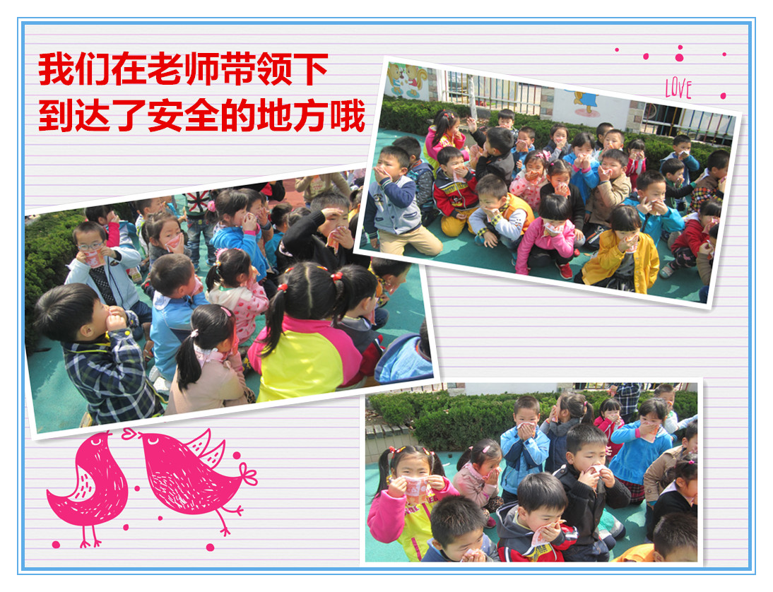 我们立即用毛巾赶紧捂住口鼻,猫着腰,在老师的带领下迅速有序的离开了教室,往安全的地方赶去。到达操场后,虞老师立即清点了我们班小朋友的人数,嘿嘿,一个都不能少哦~~