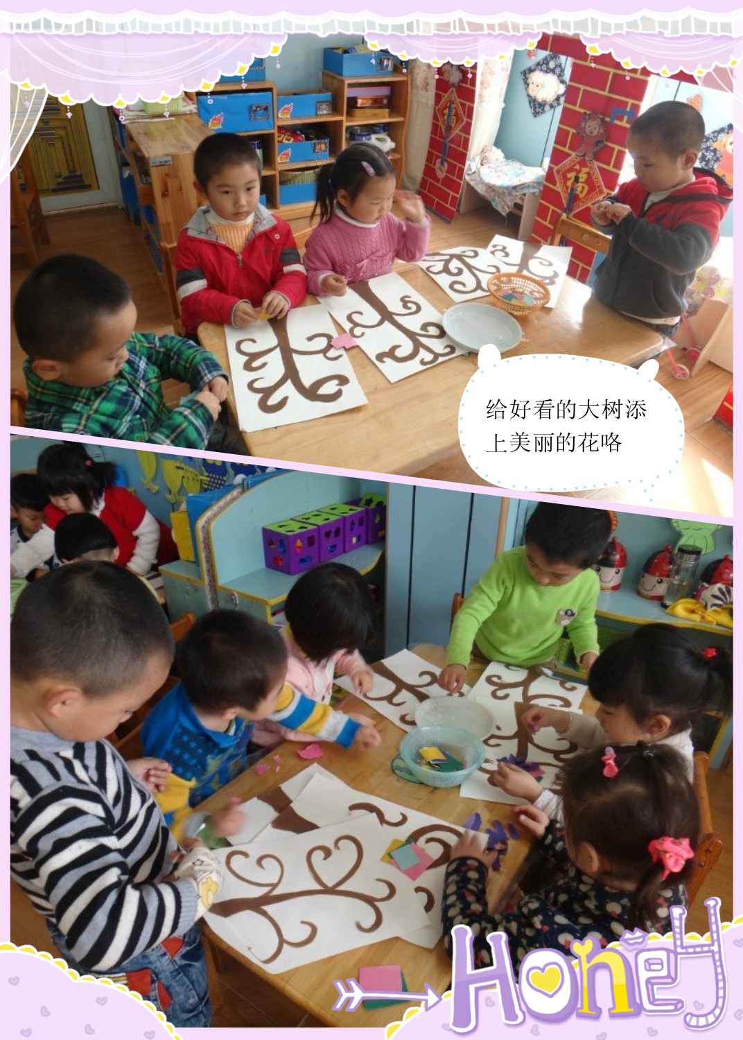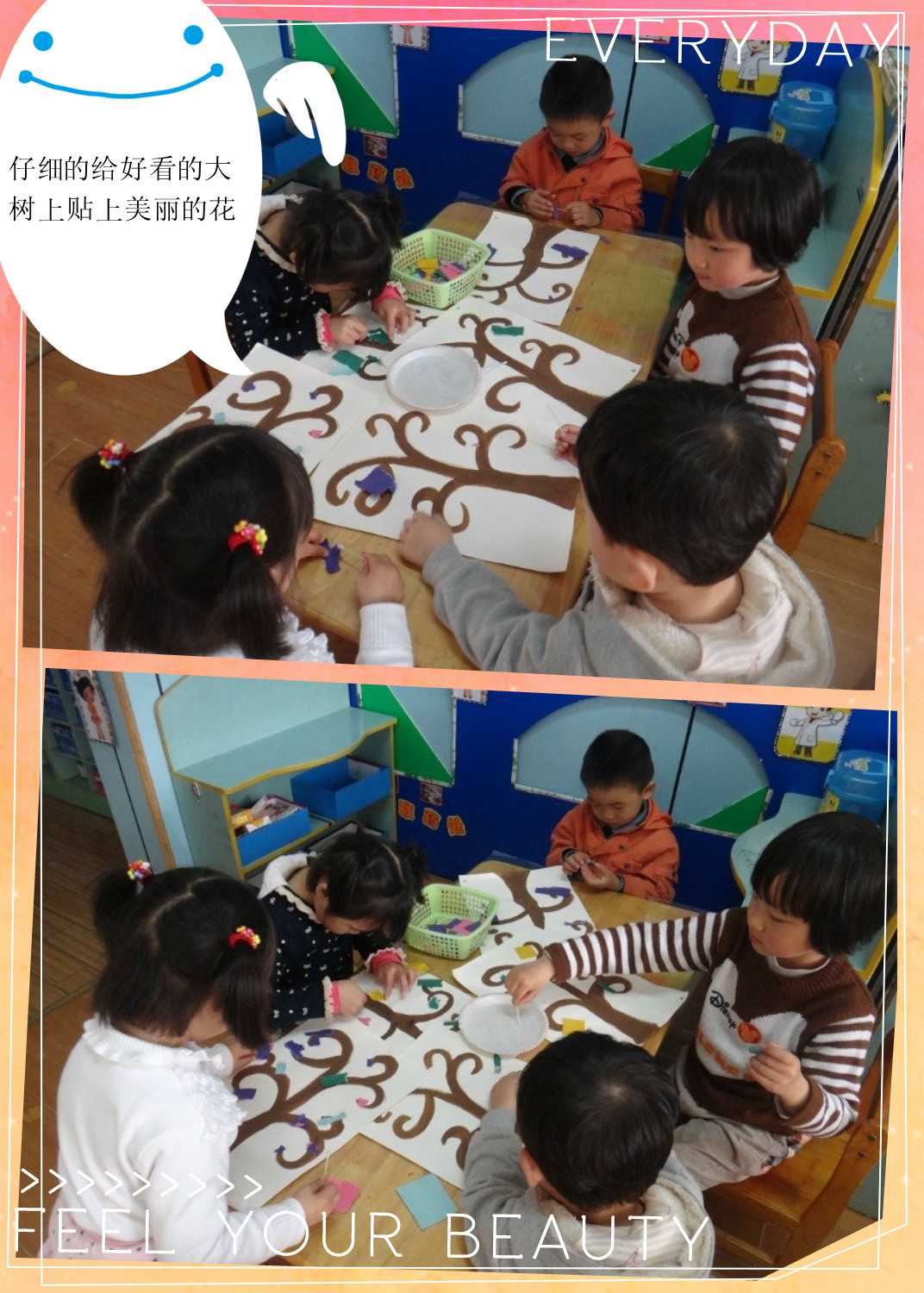 3月27号,一周一次的美术特色活动又开始啦!本次活动的主要内容是给好看的树干贴上五颜六色的花朵。春天是一个百花齐放的季节,老师先引导宝宝们说说春天里见到的花朵并请幼儿仔细欣赏春天里各种鲜艳颜色的花朵!然后宝宝们各自用动作来扮演小花,充分让宝宝们感受到春天里花朵颜色的鲜艳和美丽!之后宝宝们开始专心的做属于自己的美丽的花树啦,看看宝宝们认真操作的样子他们都想把春天里美丽的花开在自己的树上呢!