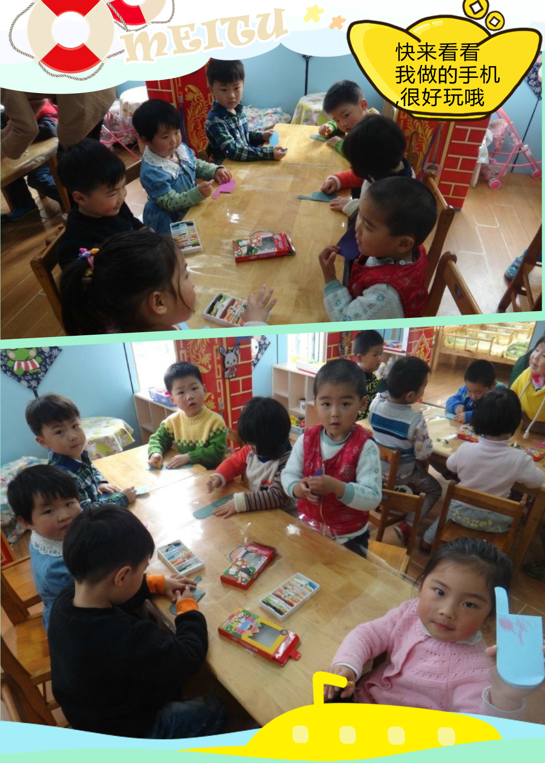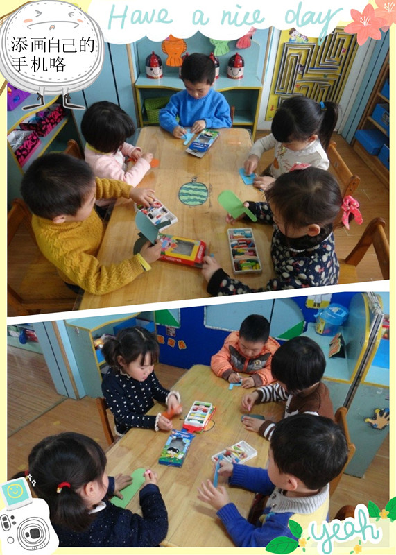 今天我们小六班开展了本学期第一次的彩虹屋活动。本次活动为宝宝们准备了每人一部手机模型,请宝宝们用自己的油画棒帮手机装饰上好看的线条图案!宝宝们对手机这个物品都很熟悉和了解,也都很想自己做一部属于自己的好看的手机。快看宝宝们绘画活动中开心的样子:有的宝宝装饰好手机以后迫不及待的请老师欣赏,希望能得到老师的称赞;有的宝宝拿起自己好看的手机和旁边的宝宝玩起了打电话的游戏!最后每位宝宝都装饰出了属于自己的好看的手机!