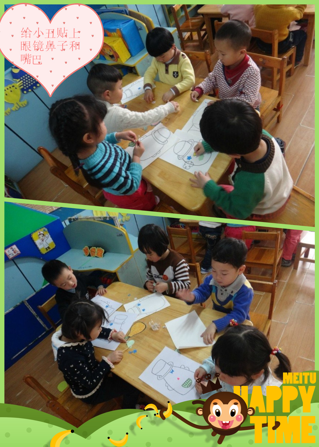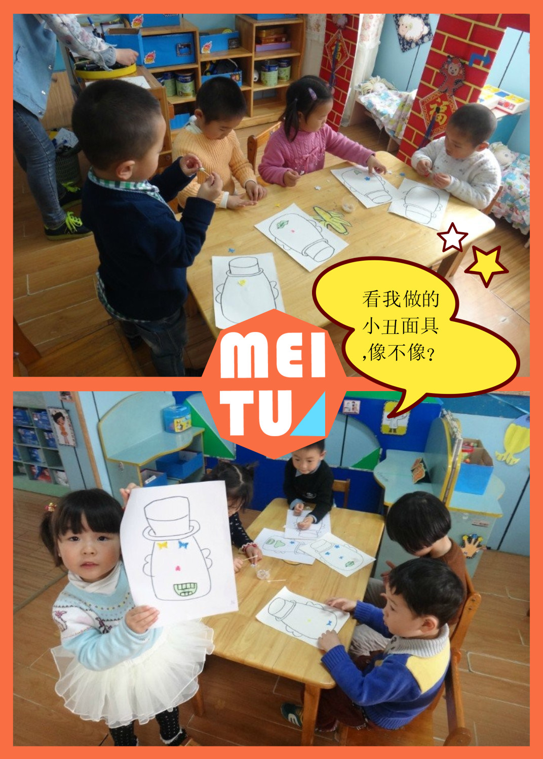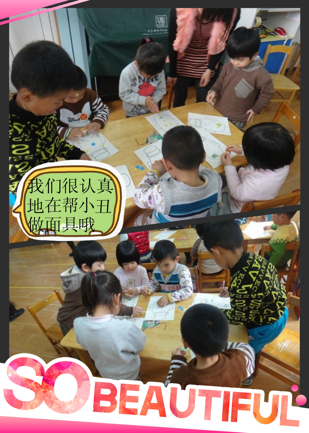 今天宝宝们认识了一个有趣的人——调皮的小丑,根据宝宝们的已有经验,他们都知道小丑的眼睛鼻子嘴巴都很夸张和奇怪。今天请宝宝们帮调皮小丑的面具上摆好贴上小丑的眼睛鼻子和嘴巴,宝贝们都对调皮的小丑很感兴趣,所以操作活动中宝贝们都在专心致志的做自己的小丑面具!赶快来看看宝贝们做的好看的小丑面具吧!